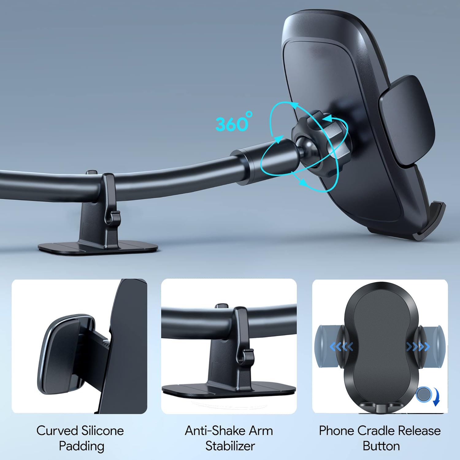 The suction cup adheres tightly to car surfaces using negative pressure technology, while the silicone pad provides anti-slip protection.