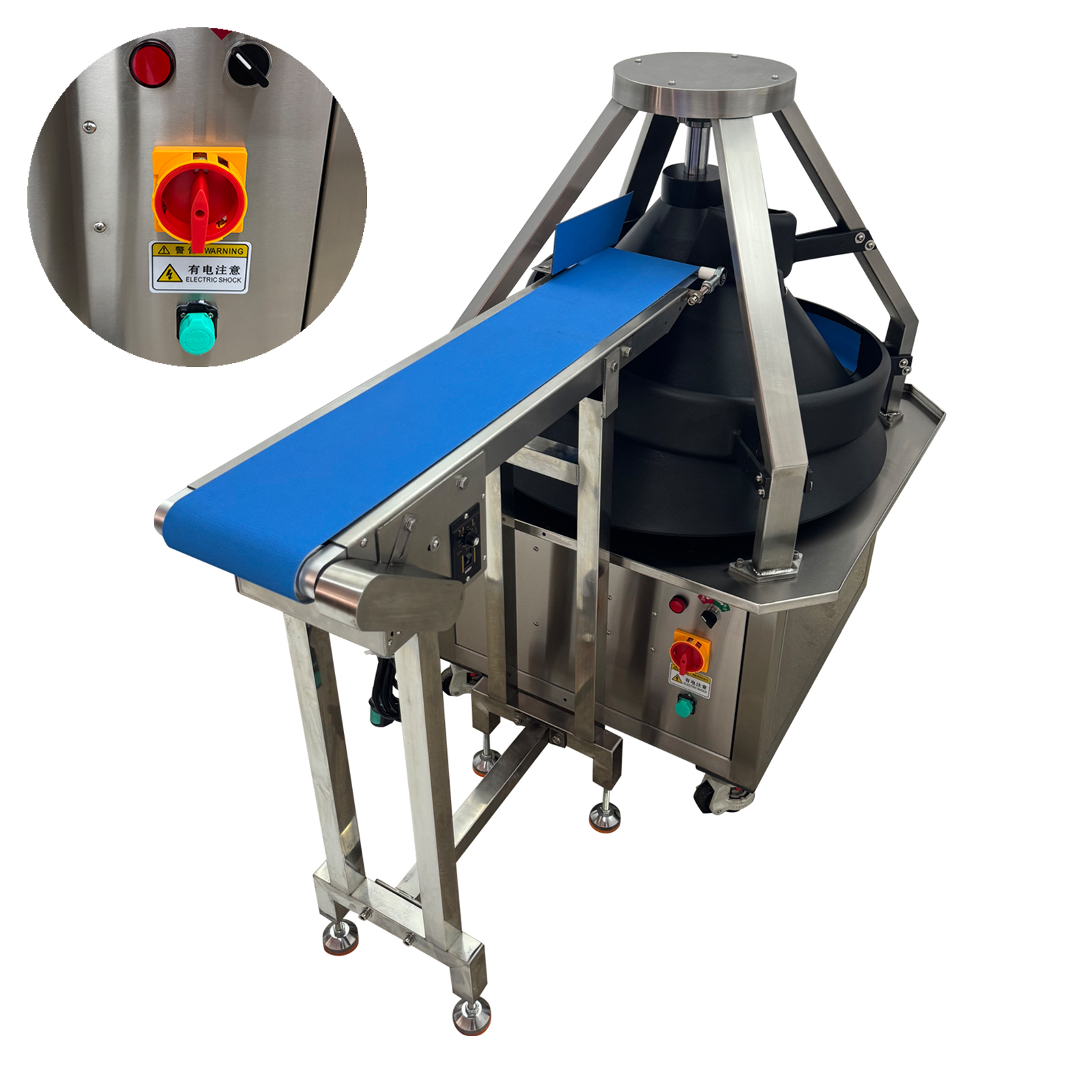 | 1. Installation & Preparation Place the machine on a level, stable, dry, and well-ventilated workbench. Ensure the power supply voltage matches the machine's requirements and that the power source is equipped with a leakage protection device (RCD/GFCI) and is properly grounded (earthed). Before initial use, check that all fasteners are tight (not loosened during transport) and ensure the cone rotates freely without any obstruction or friction. 2. Pre-Operation Check Confirm the power switch is in the OFF position. Gently rotate the cone by hand to confirm it moves smoothly and without obstruction. Use an air gun or a soft, dry cloth to clean the cone and feeding belt, ensuring they are free of dust or foreign objects. 3. Startup & Test Run Connect the power supply. Press the "START" button and allow the machine to run without load (empty) for a short while. Observe and listen to ensure the machine operates smoothly, without abnormal noise or vibration. If any abnormality is detected, stop the machine immediately and inspect. 4. Feeding Operation Place uniformly weighted divided dough pieces onto the feeding conveyor belt sequentially and evenly. Ensure adequate space between dough pieces to prevent them from colliding during the rounding process. 5. Running & Collection The machine will automatically draw the dough pieces into the conical rounding area and roll them into perfect spherical balls. The rounded dough balls are automatically discharged from the outlet onto a integrated conveyor belt. The balls are carried gently along the belt, allowing for a brief resting period or transportation to the next station. Place a tray or basket at the end of the conveyor belt to collect the finished dough balls in an orderly manner. 6. Shutdown After all dough pieces have been processed, let the machine run empty for a few more seconds to ensure all material is discharged. Press the "STOP" button. Turn off the main power switch and disconnect the power cord. 7. Cleaning Important: Always ensure the machine has come to a complete stop and is disconnected from the power supply before cleaning. Use a soft, damp cloth and a neutral cleanser to thoroughly wipe down all food contact surfaces (e.g., cone, conveyor belt). After cleaning, dry all parts with a clean cloth to prevent rusting. |