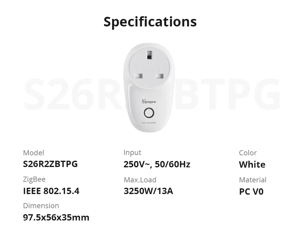 SONOFF S26R2ZB is a ZigBee smart plug with UK/DE/FR standard. Users can instantly convert normal plug into a smart plug, it can work with other smart devices, like triggered on/off by temp, make your life smarter.