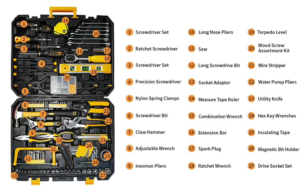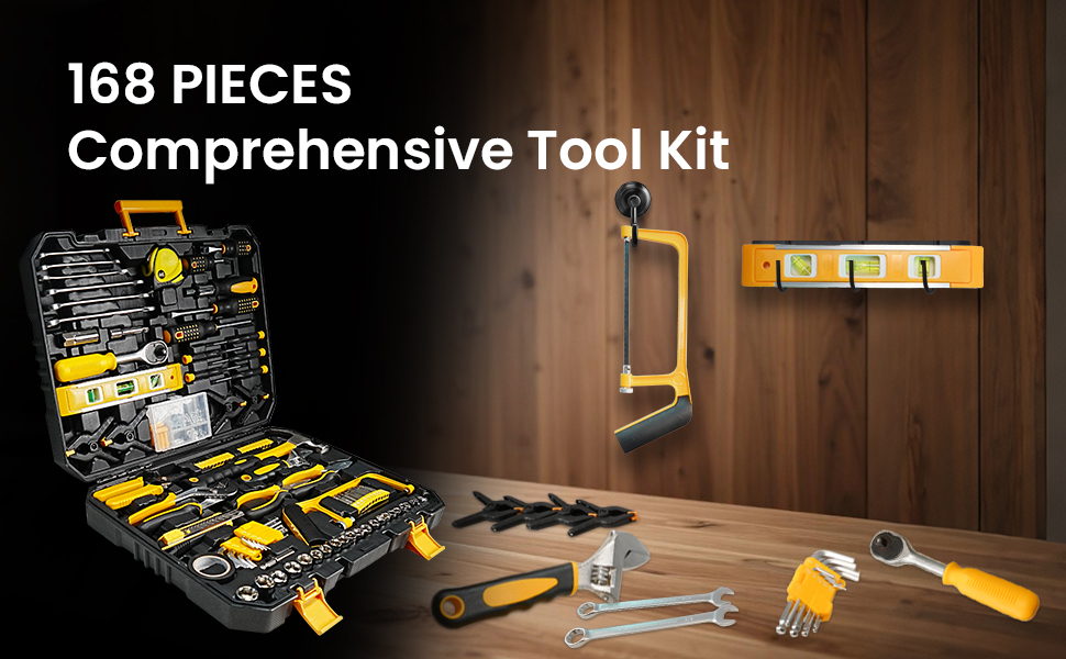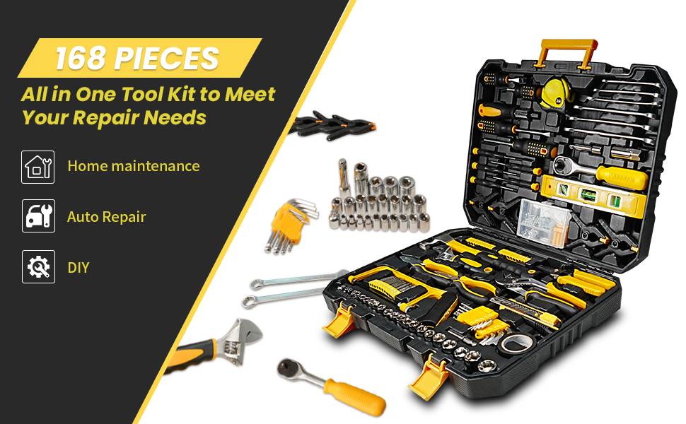 This 168-piece tool set includes everything you need for basic home repairs, automotive maintenance, and DIY projects. From sockets and wrenches to screwdrivers, pliers, a voltage tester, utility knife, hammer, tape measure, and over 100 bits—each tool is neatly organized in a durable molded case for quick access and efficient storage.