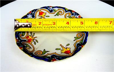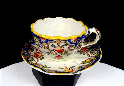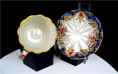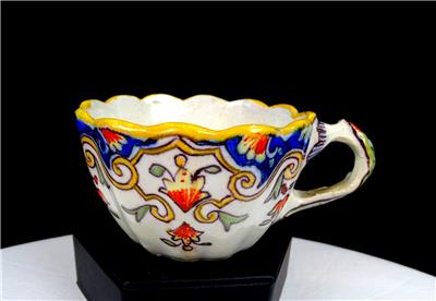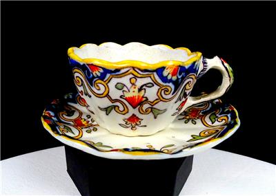 Rouen #1494 French Faience Antique Blue & Yellow Porcelain Rare Scalloped 2" Cup & Saucer Set 1860-1900