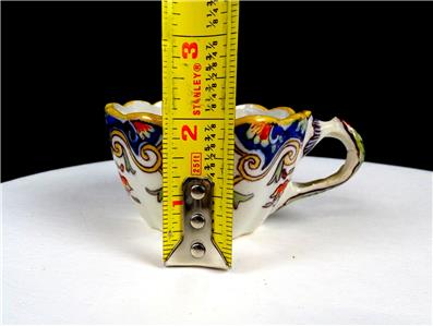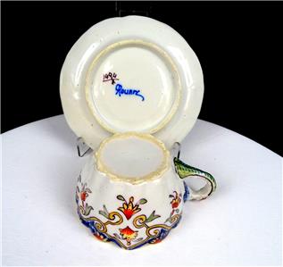 This at least One Hundred and Twenty Three Year old Cup & Saucer set is in Excellect Condition With No Cracks No Crazing. NOTE: There are some Glaze rubs on the rim of the Cup and Saucer they feel rough to the touch. Very nice older Cup & saucer Set. The colors are nice and bright in a floral and scroll pattern. The cup and saucer are both fluted and scalloped. The base of the saucer has Rouen hand written in Blue under glaze and the Number 1494 hand written in Brown ink under glaze.