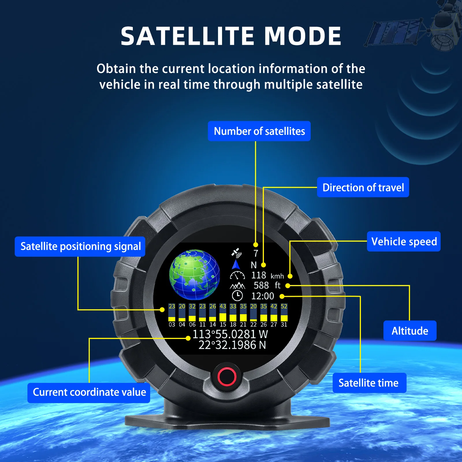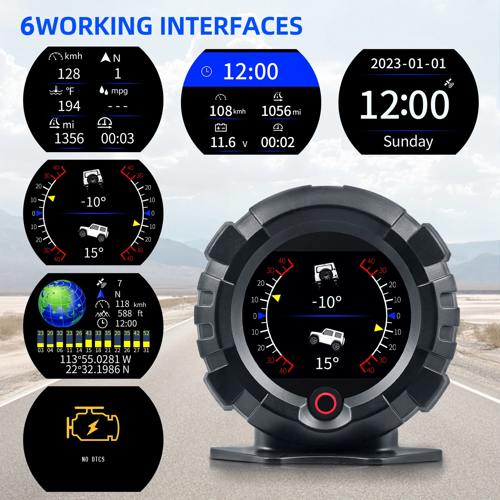 This GPS system multi-functional instrument can measure the slope and inclination of the off-road vehicle, provide vehicle speed, height and vehicle direction, and has a high-precision satellite real-time clock function.
