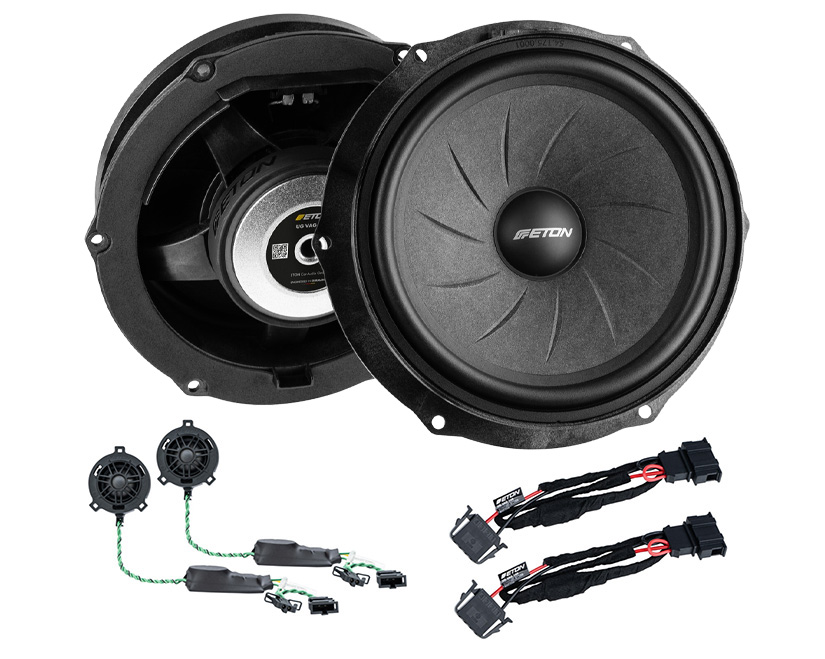1 x Eton UG-VAG180 + UG-VAG25 (Bestehend aus 2 Stück Hochton Lautsprecher, 2 Stück Tiefton Lautsprecher, 2 Stück Weichen (integriert/Extern)) 1 x Fahrzeugspezifisches Einbauset (siehe Bilder)