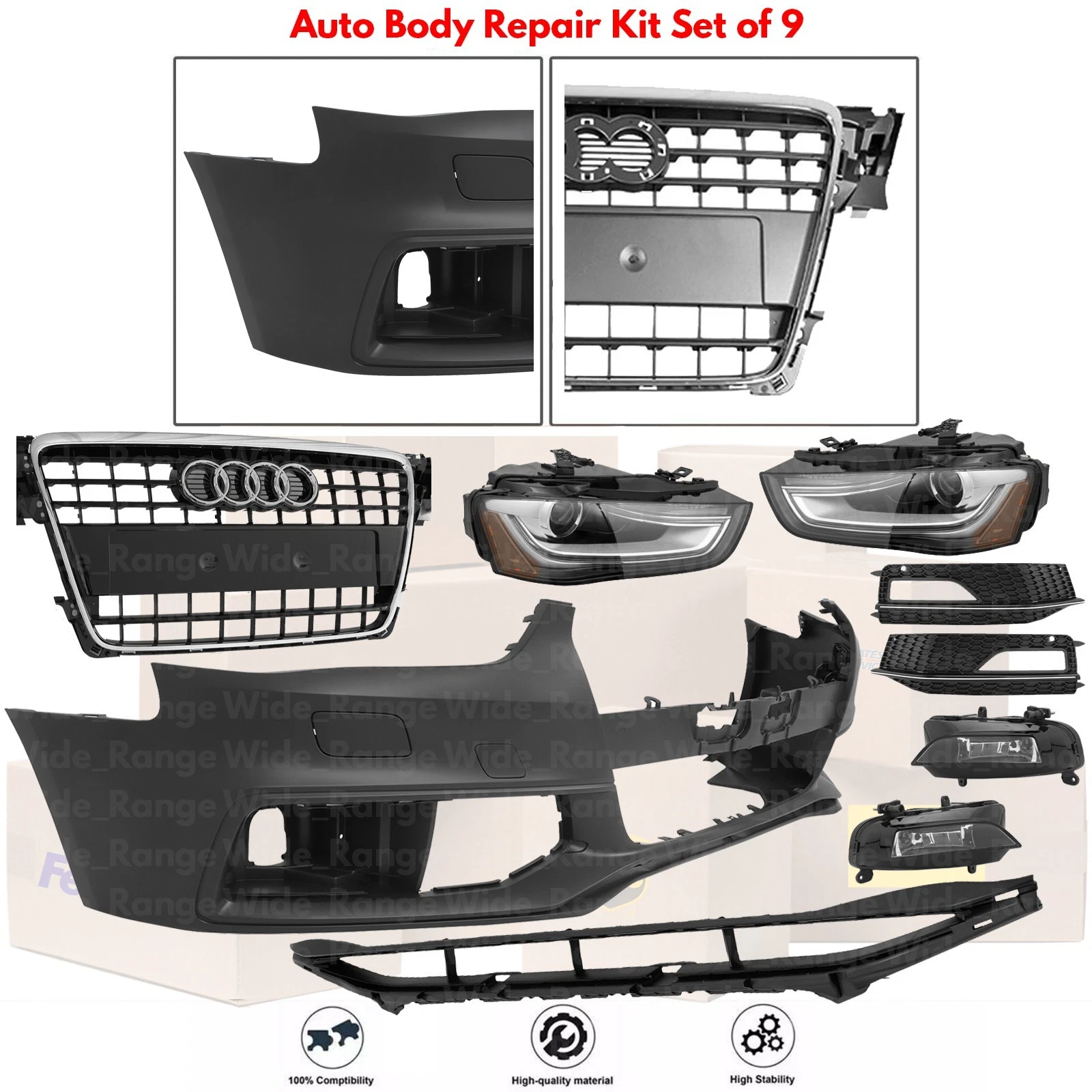 | Items Included | (1) Front Bumper Cover (1) Grille Assembly (1) Headlight Assembly set of 2 (1) Fog Light Assembly Set of 2 (1) Fog Lights Trim Set of 2 (1) Lower Grille |