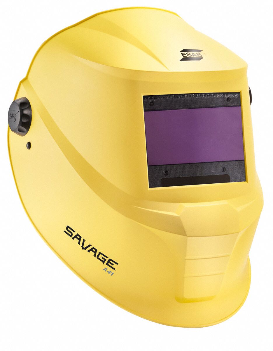 Welding Helmet, ADF Controls Digital, Battery Chemistry Lithium Ion, Battery Life 2,000 hr, Battery Type Solar Cell, Replaceable Battery, Color Yellow, Compatible Suspension Brand Name Savage, Compatible Suspension Grainger Part Number Not Applicable, Compatible Suspension Manufacturer Part Number 0700000483, EN379 Classification 1/1/1/2, Features Wide Coverage and a Large Viewing Area, Graphics Savage, Grind Mode Yes, Hat Size Maximum 8, Hat Size Minimum 6 7/8, Head Diameter Maximum 7 4/5 in