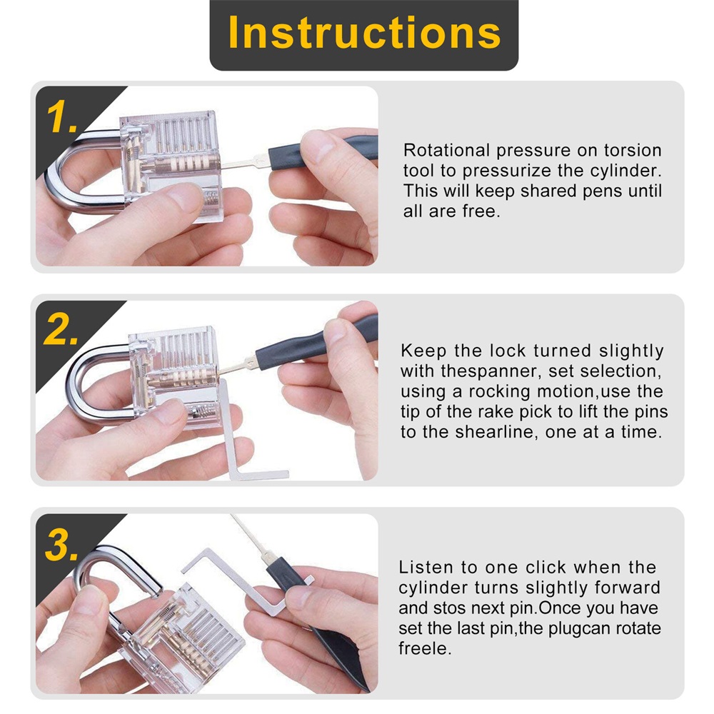 6.Steadfast and Enduring: This lock picking set is made of high-quality stainless steel and ABS material, which are strong and sturdy. It can be used for a long time without breaking or rusting.