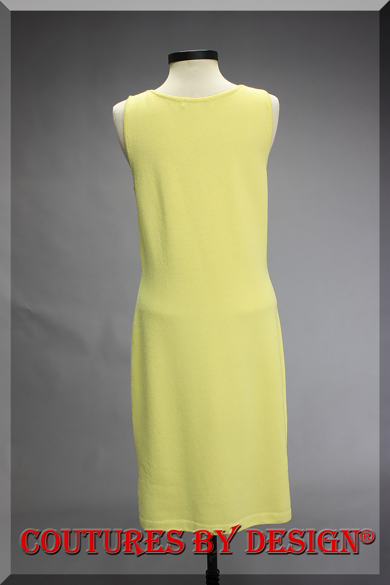 St John Knits Sport Label Sport Santana Knit sheath dress in light yellow. This vibrant sleeveless dress has scoop neckline and 4" vents on the sides. The perfect shift dress for any occasion! Fabric Content is: 78% Wool 22% Wool