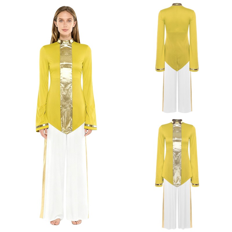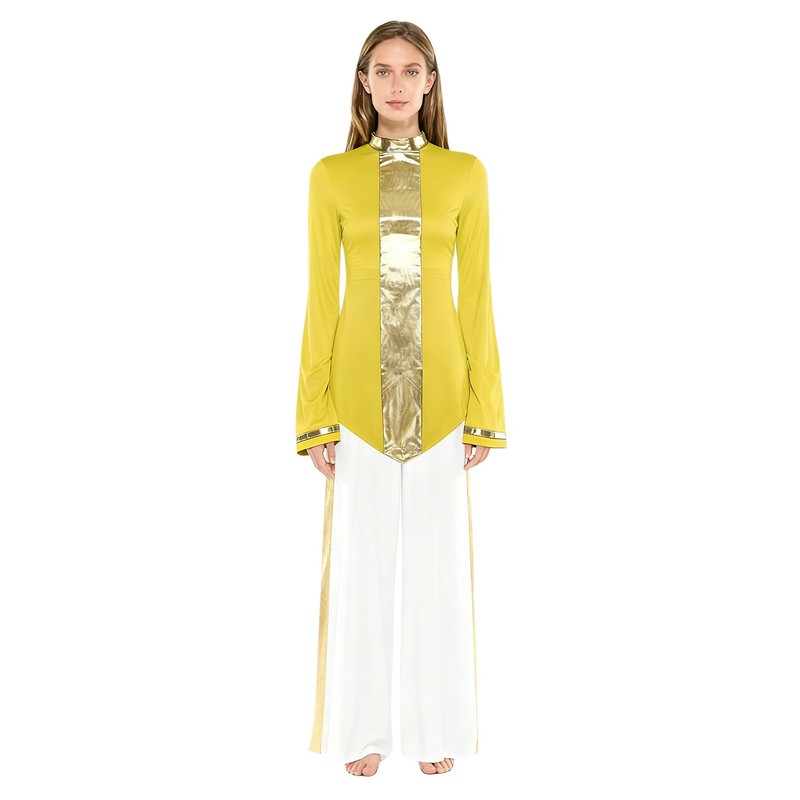 Flared long sleeves bring a touch of elegance and movement, enhancing the visual appeal of the dance performance.