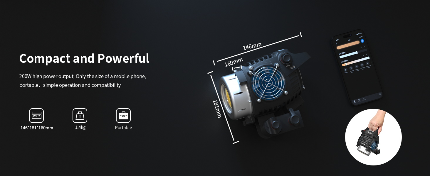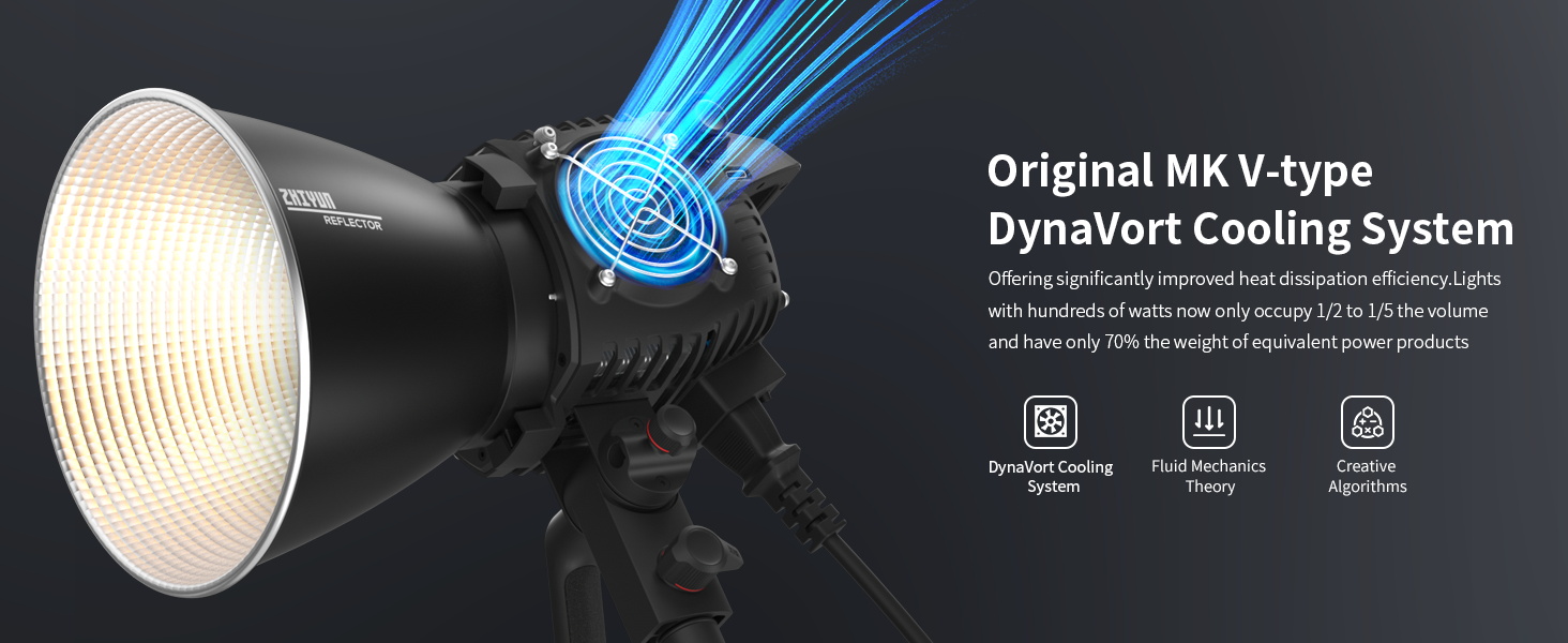 DynaVort MK V Cooling System: ZHIYUN Series B is powered by the latest DynaVort MK V cooling system. Dual pressure sensors, eliminates turbulence and maximizes airflow, dramatically improving thermal efficiency. As a result, B series lights offer hundreds of watts of power occupying only 1/2 or 1/5 of the volume and weighing only 70% of comparable products.