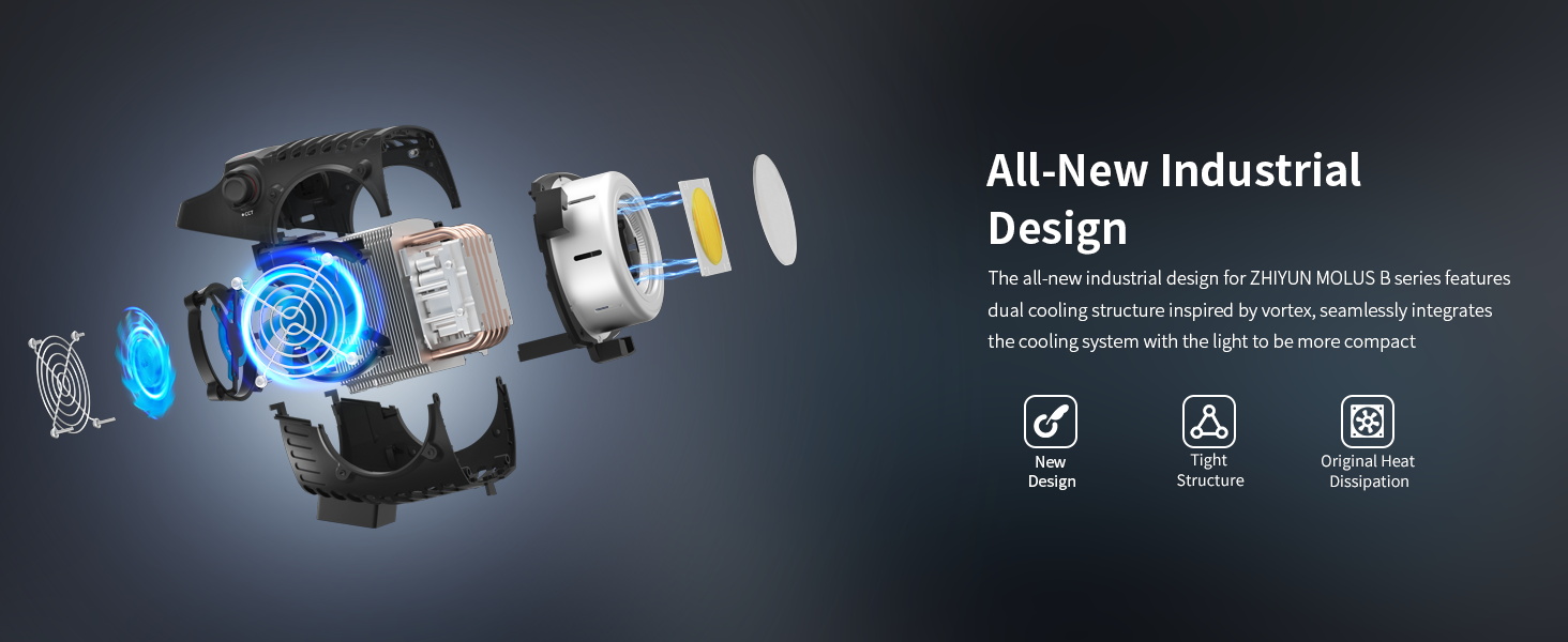 The Zhiyun MOLUS B-Series has a new industrial design that integrates the cooling system with the light, inspired by the vortex to be more compact.