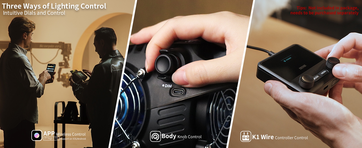 3 Steuermethoden: Die ZHIYUN B-Serie bietet drei Steuerungsoptionen zur Anpassung der Beleuchtung. Sie verfügt über voreingestellte Tasten für Farbtemperatureatur/Helligkeit und einen Drehknopf für direkte Anpassungen. Darüber hinaus unterstützt sie die drahtlose Lichtsteuerung über die ZY Vega APP, mit der Sie die Lichter drahtlos über Ihr Smartphone steuern können. Sie kann auch mit dem K1 Controller (nicht im Lieferumfang enthalten) gesteuert werden.
