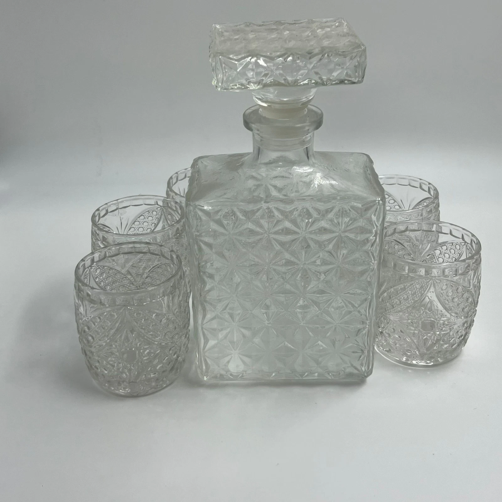Vintage Crystal Glass Set 7 Pieces – Cut Pattern Decanter with 6 Matching GlasseVintage Crystal Glass Set 7 Pieces – Cut Pattern Decanter with 6 Matching Glasse Add a touch of classic elegance to your home décor with this beautiful Vintage Crystal Glass Set, featuring 7 pieces crafted in a stunning cut–pattern design. The set includes a heavy, square-shaped decanter with a matching crystal stopper, along with six beautifully detailed glasses that complement its vintage style. Each piece is made from thick, clear crystal-style glass with raised geometric patterns that catch the light beautifully. The craftsmanship and design give the set a timeless look, making it ideal for display, serving guests, or adding charm to any vintage-inspired collection. Condition