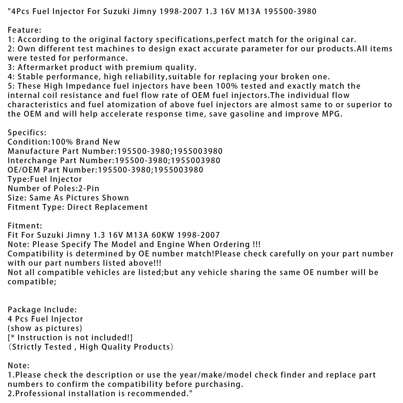 5: These High Impedance fuel injectors have been 100% tested and exactly match the internal coil resistance and fuel flow rate of OEM fuel injectors.The individual flow characteristics and fuel atomization of above fuel injectors are almost same to or superior to the OEM and will help accelerate response time, save gasoline and improve MPG.
