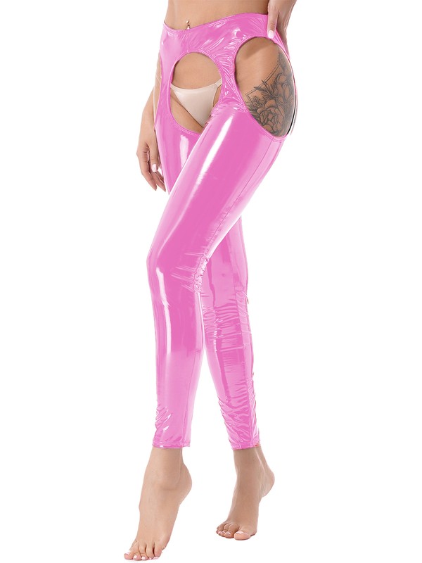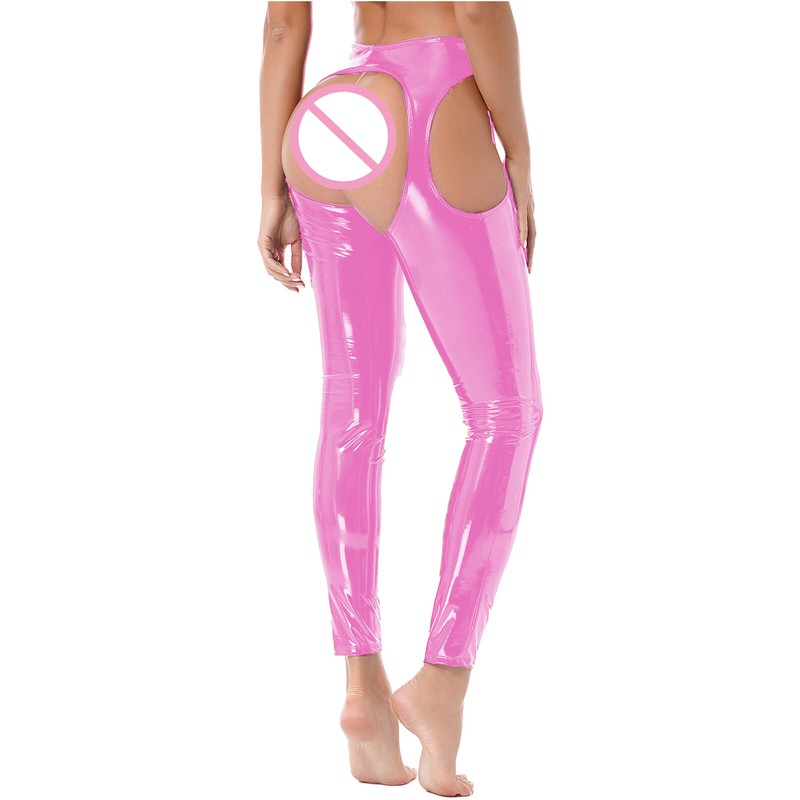 Womens Wet Look High Waist Cutout Leggings Crotchless Open Butt Patent Leather Skinny Pants.
