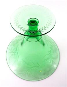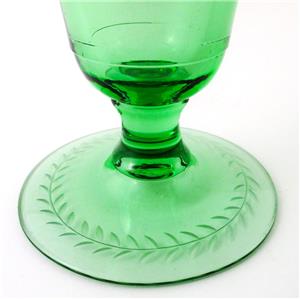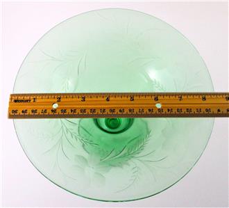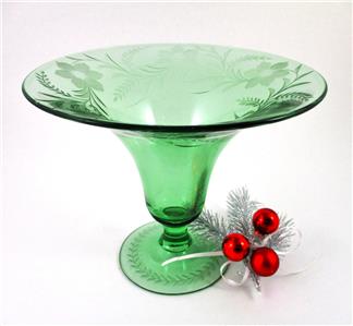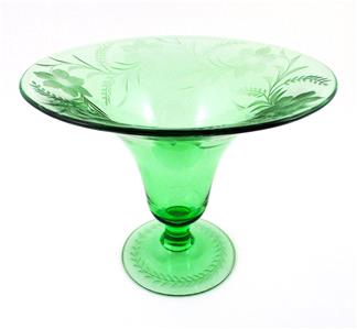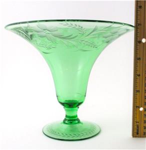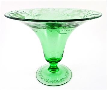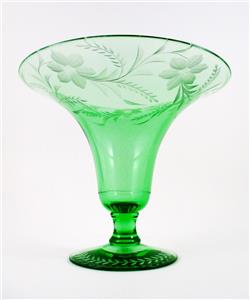 This is an elegant Depression era Footed, Flared, Bell shaped VASE decorated with a lovely Gray Cut, Floral Etched design - in a beautiful emerald color called "Royal" GREEN - from the Fostoria Glass Co. - circa 1925.