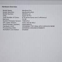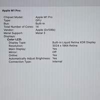 2021 Apple MacBook Pro 14" M1 Pro 14C GPU 3.2GHz 16GB RAM 512GB SSD MKGR3LL/A Items included in this sale: 2021 Apple MacBook Pro 14" M1 Pro 14C GPU 3.2GHz 16GB RAM 512GB SSD MKGR3LL/A Sorry, no box or anything else included *Please note, if it is not listed it is not included - such as power cables or other accessories. Specifications: Collection Apple Computers Sub-Collection Apple MacBook (M-Chip Only) Brand Apple Model MacBook Pro MPN MKGR3LL/A Release Year 2021 Processor Brand Apple Processor M1 Pro Processor Cores 8C CPU Processor Speed 3.2GHz GPU (Cores) or Graphics Card 14C GPU Memory (Ram) 16GB RAM Storage 512GB Storage Type SSD Screen Size 14" Display Liquid Retina XDR Resolution 3024 x 1964 Retina Yes Touch Bar/Fingerprint Sensor No/Yes Bluetooth Yes Webcam Yes Microphone Yes WiFi Yes Color Silver Has Limited Warranty? No Apple Limited Warranty Has AppleCare+? No AppleCare+ Condition Good Operating System Sonoma 14.8.2 Connections 3x Thunderbolt 4 (USB-C) Port 3.5mm Audio Jack HDMI Port SDXC Card Slot MagSafe 3 Cycle Count 28 Battery Condition Normal Maximum Battery Capacity 100% UPC 194252551059 Serial# DQX036N22J Password N/A Cosmetic condition: The top, bottom, sides and screen are in good cosmetic condition with minimal wear. All of the ports are in good condition and clean. The keyboard is in good condition with some minor wear and signs of use. The hinges are in good condition, sturdy and functioning properly. The bezel is in good cosmetic condition with little to no wear. Please view our close up photos, as these are taken of the actual item being offered for sale. Functionality condition: The LCD is fully functional with no damage or issues. I was able to connect to a WiFi network and test the audio by playing a video. The WiFi and audio are both fully functional. The keyboard has been tested and all keys function properly. The touch functions have been tested and are fully functional.