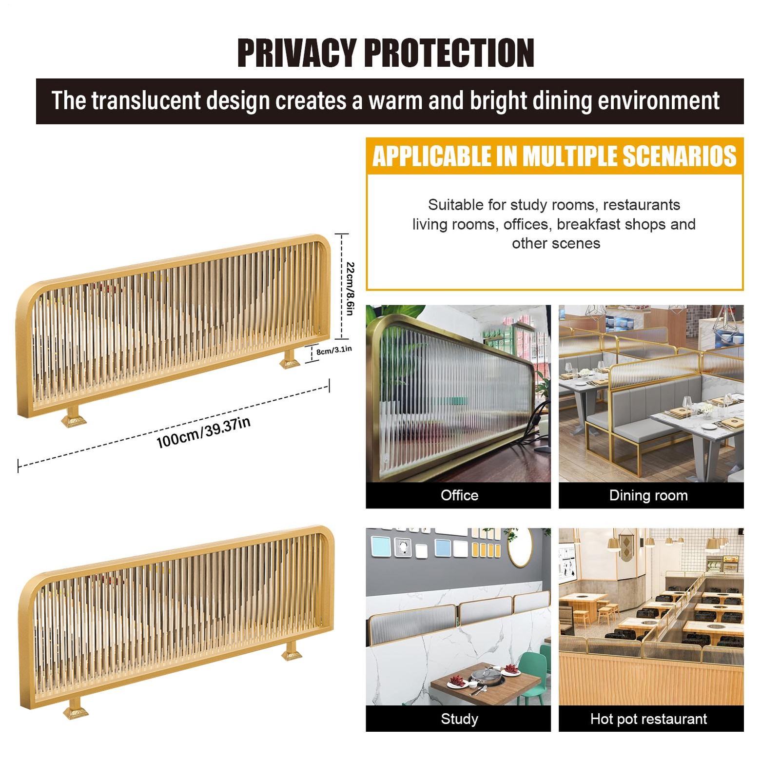 Our privacy screen indoor with its fashionable design will make a perfect addition to any space. It creates a warm and bright dining environment while allowing you to feel more at ease during use. This versatile screen can be used as a booth partition, a half-wall screen or a desktop decoration. With easy daily maintenance, this screen is the perfect addition to your decor.