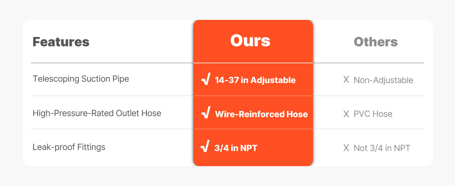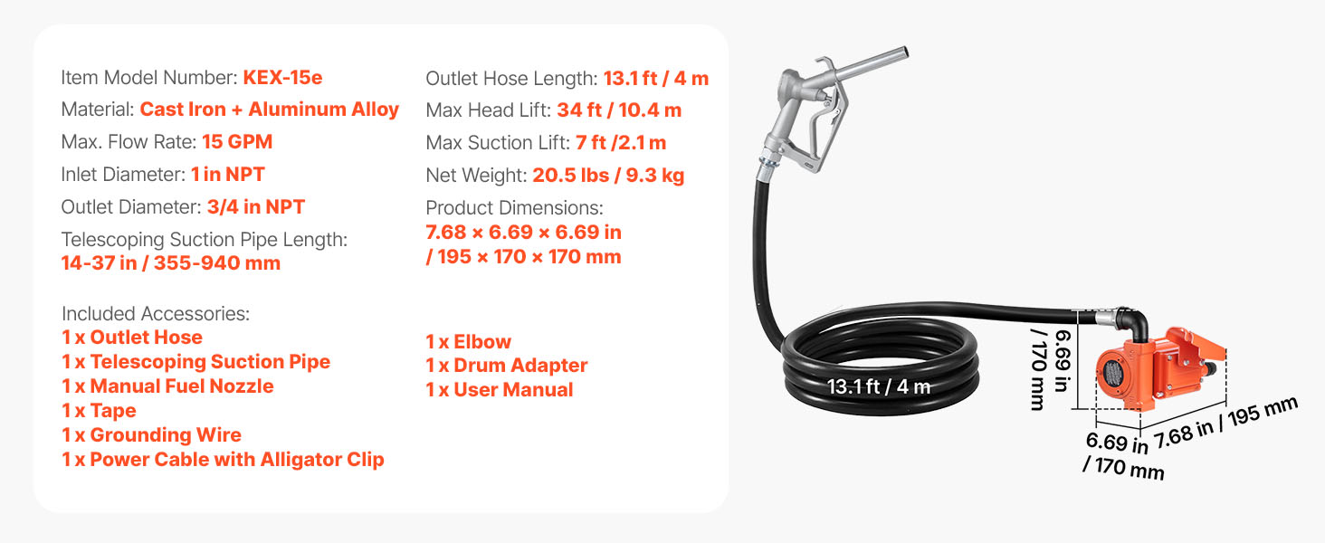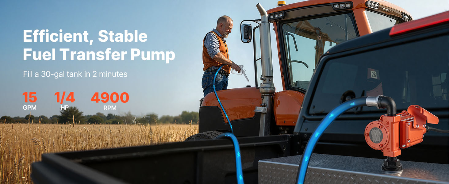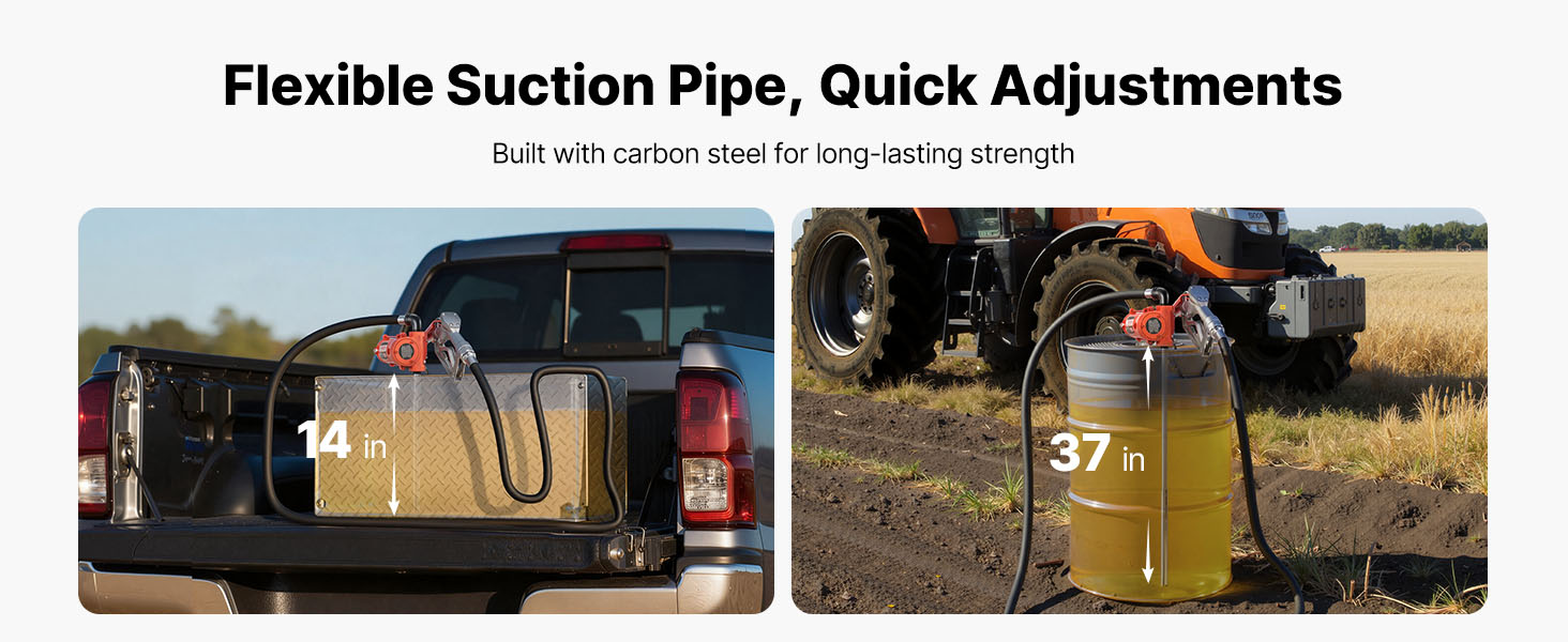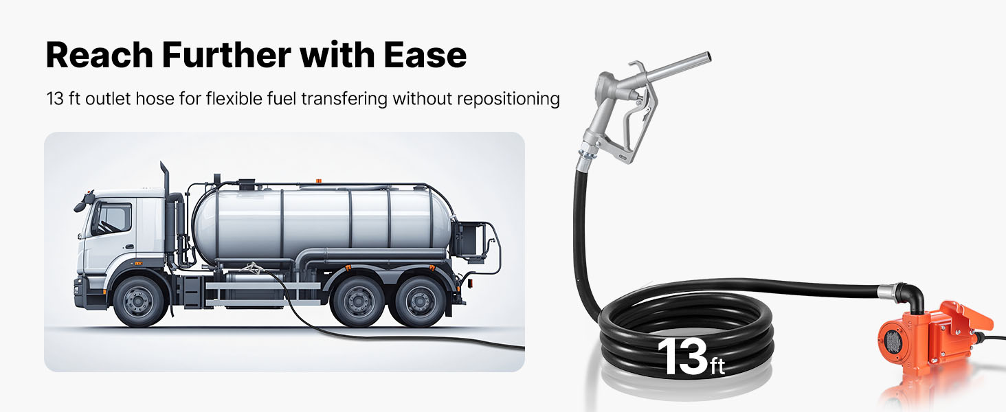 - Alimentation en carburant efficace : Débit jusqu’à 57 L/min grâce à un moteur de 4 900 tr/min, une hauteur de refoulement maximale de 10,4 m et une hauteur d’aspiration de 2,1 m. Notre pompe de transfert de carburant 12 V est compatible avec l’essence, le diesel et le kérosène pour des transferts rapides et polyvalents