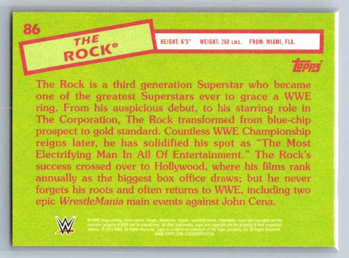 | Description: | The Rock | | Category: | Wrestling | | Year: | 2015 | | Product: | Topps WWE Heritage | | Card Number: | 86 | | Dimensions: | 3½" x 2¾" | | SKU: | WR B0001 R01 B (25) |