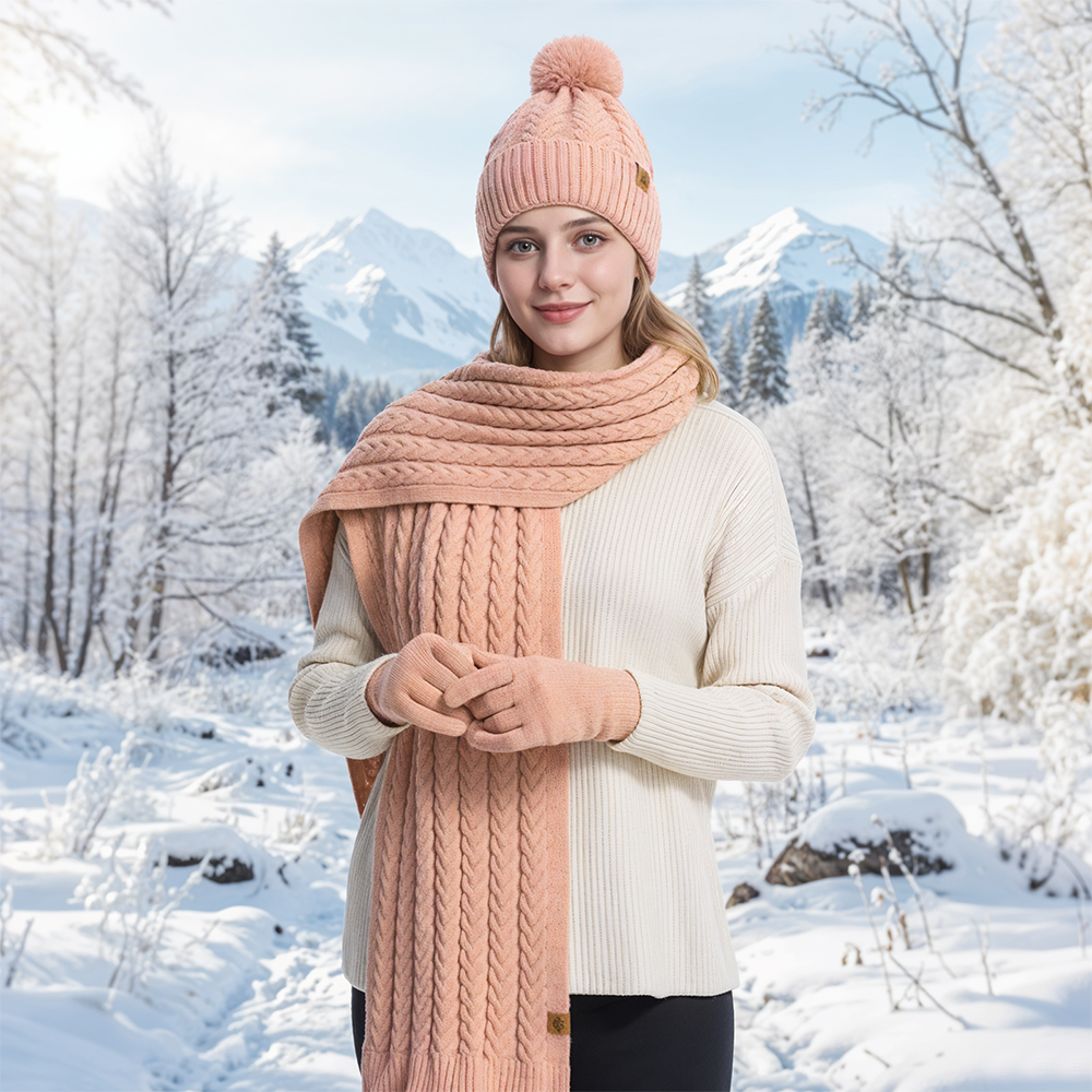 Elevate your cold-weather wardrobe with this premium 3-piece cable knit set—featuring a pom-pom beanie, oversized scarf, and full-finger gloves—designed to keep you warm, comfortable, and stylish all season long.