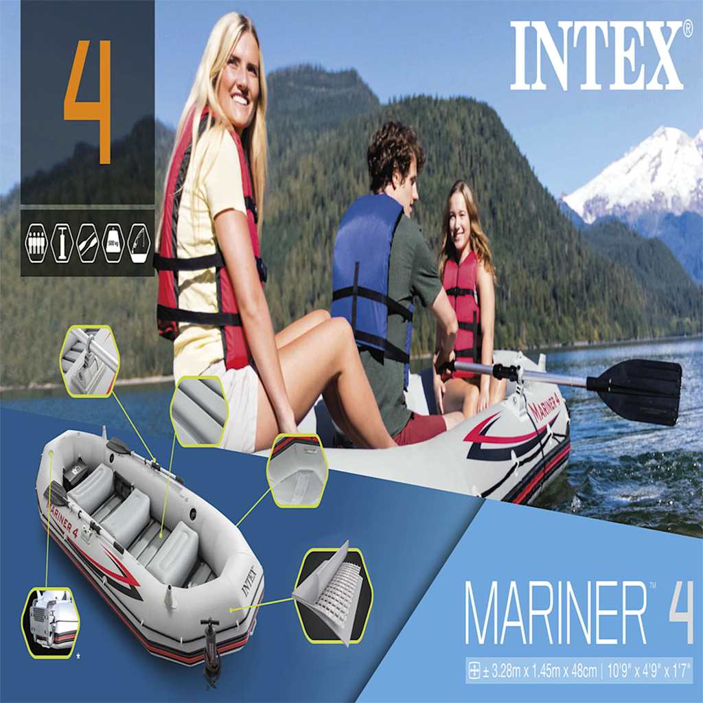 Dieses 68376NP Mariner 4 Schlauchboot von Intex ist die ideale Wahl für eine Freizeittour auf dem ruhigen See. Dieses aufblasbare Boot bietet Platz für bis zu vier Erwachsene mit einem maximalen Gesamtgewicht von 500 kg.