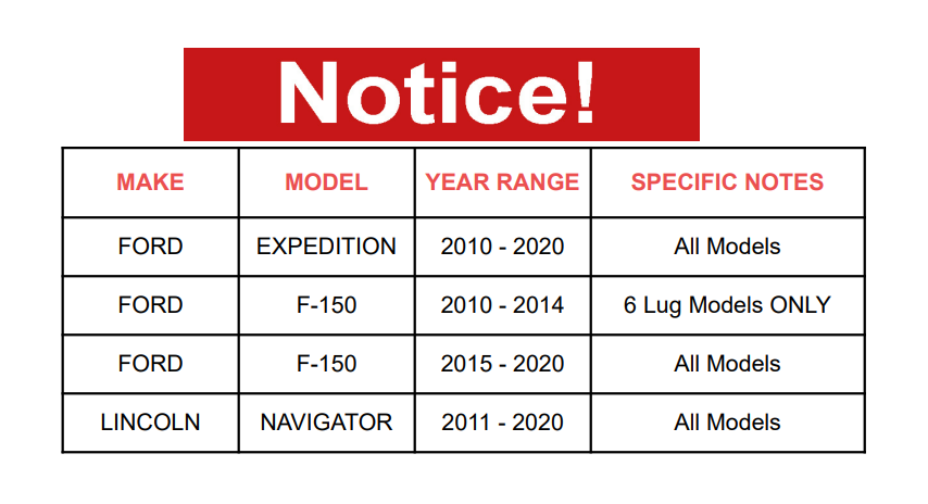 | FORD | F-150 | 2010 - 2014 | 6 Lug Models ONLY |