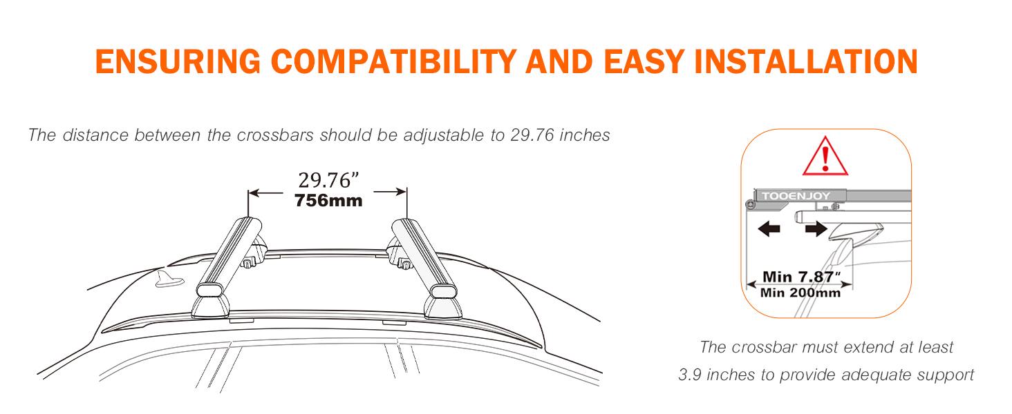 - Universal Compatibility - Our roof rack is compatible with most crossbar systems, providing versatility for a wide range of users. It offers two connection options: U-Bolts and T-Slot Bolts. The recommended center distance between the two bars is 29.76". For any inquiries or assistance, please contact our customer support.