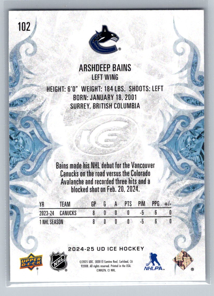 | 2024-25 Upper Deck Ice Arshdeep Bains RC Vancouver Canucks #102 |