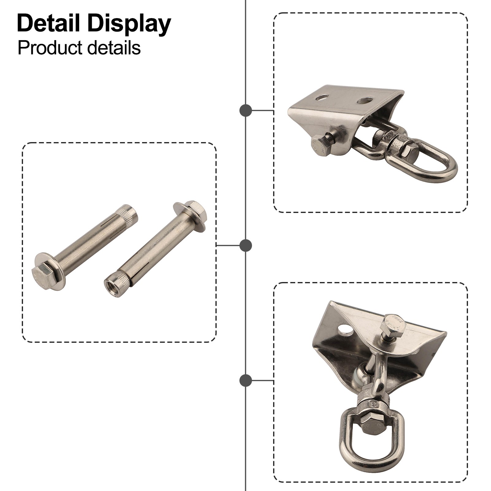 Caractéristiques:*Matériau: Les crochets de plafond sont fabriqués en acier inoxydable 304, garantissant une résistanceà la rouille,à la, duretéélevée et résistanceà l'usure. Ils sont extrêmement solides.*Sûreté et robustesse: Avec une capacité de charge maximale de 450 kg, les crochets de plafond offrent une solution de suspension sûre et fiable. La fonction de rotationà 360° empêche les emmêlements ou torsions, offrant une grande flexibilité.*Installation facile: crochets de plafond sont livrés avec des trous pré-percés, rendant l'installation un jeu d'enfant. Ils peuventêtre facilement montés sur n'importe quel plafond fixe, mur ou poutre en bois.*Gamme d'applications large: Ces crochets de plafond sont parfaits pour suspendre des hamacs, des appareils d'entraînement en suspens, des chaises flottantes, des balançoires nid d'oiseau, des serviettes de yoga, des voiles solaires, des chaises suspendues et des sacs de surf.*Service satisfaisant: Nous nous efçons de fournir une expérience fluide et sans frustration pour chaque . Si vous rencontrez des problèmes lors de l'utilisation de produits, veuillez contacter librement notre service d'assistance pour une aide immédiate. Spécifications:*Nom du produit: Crochet de plafond en acier inoxydable*Matériau: Acier Inoxydable*Taille: Comme indiqué*Couleur: Argenté*Adaptation: Pour hamacs, appareils d'entraînement en suspens, chaises flottantes,nids d'oiseaux suspendus, trous de suspension, serviettes de yoga, voiles solaires,chaises suspendues et sacs de surf.*Nombre de pièces: Un ensemble Contenu de l'emballage: 1* Ensemble de crochets de plafond Remarque: 1. La couleur réelle de l'article peut légèrement différer des images affichées sur le site web causées par de nombreux facteurs tels la luminosité de votreécran et celle de la lumière. 2. Veuillez autoriser une petite déviation manuelle pour les données.