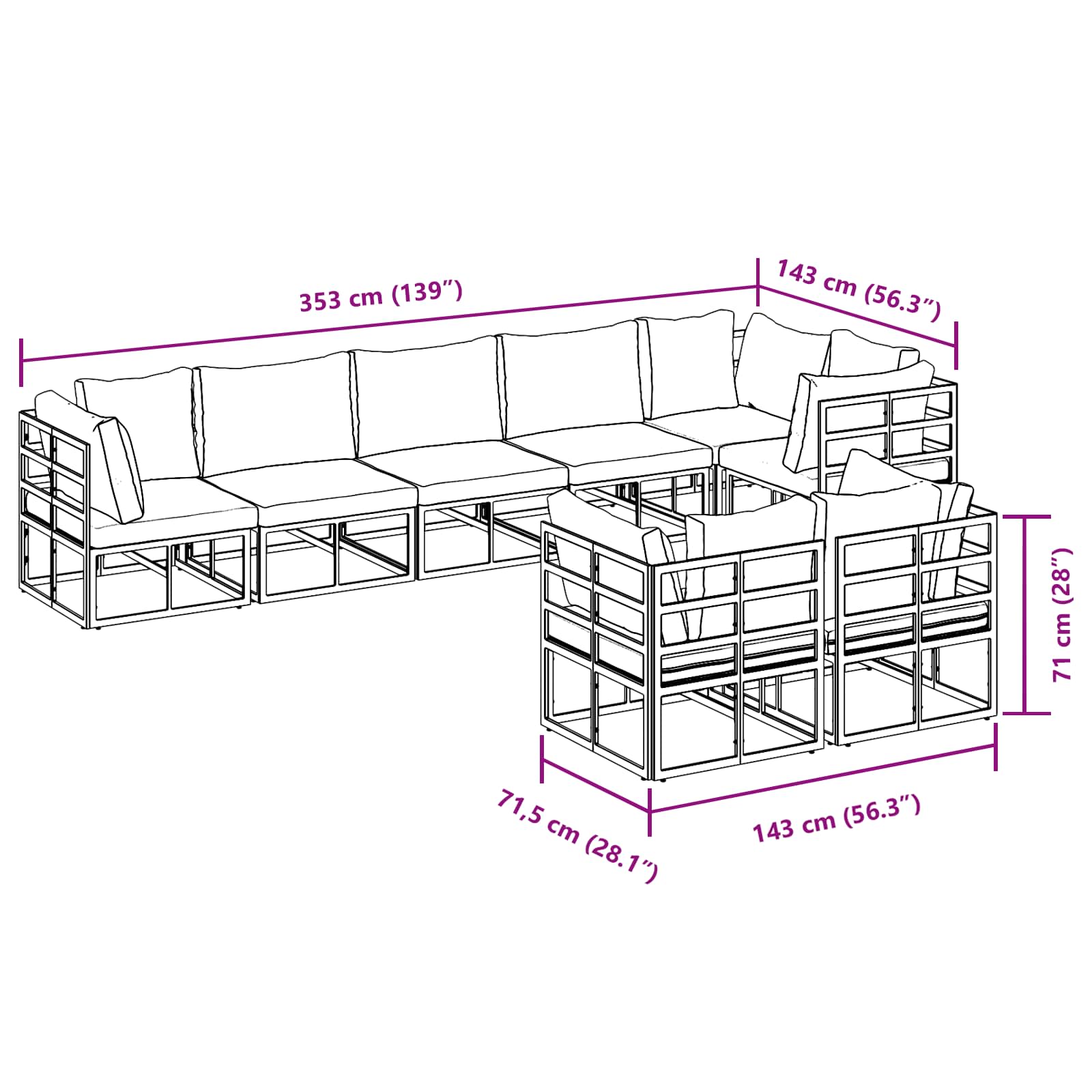 5 x siège d'angle : 71.5 x 71.5 x 71 cm (LxWxH)