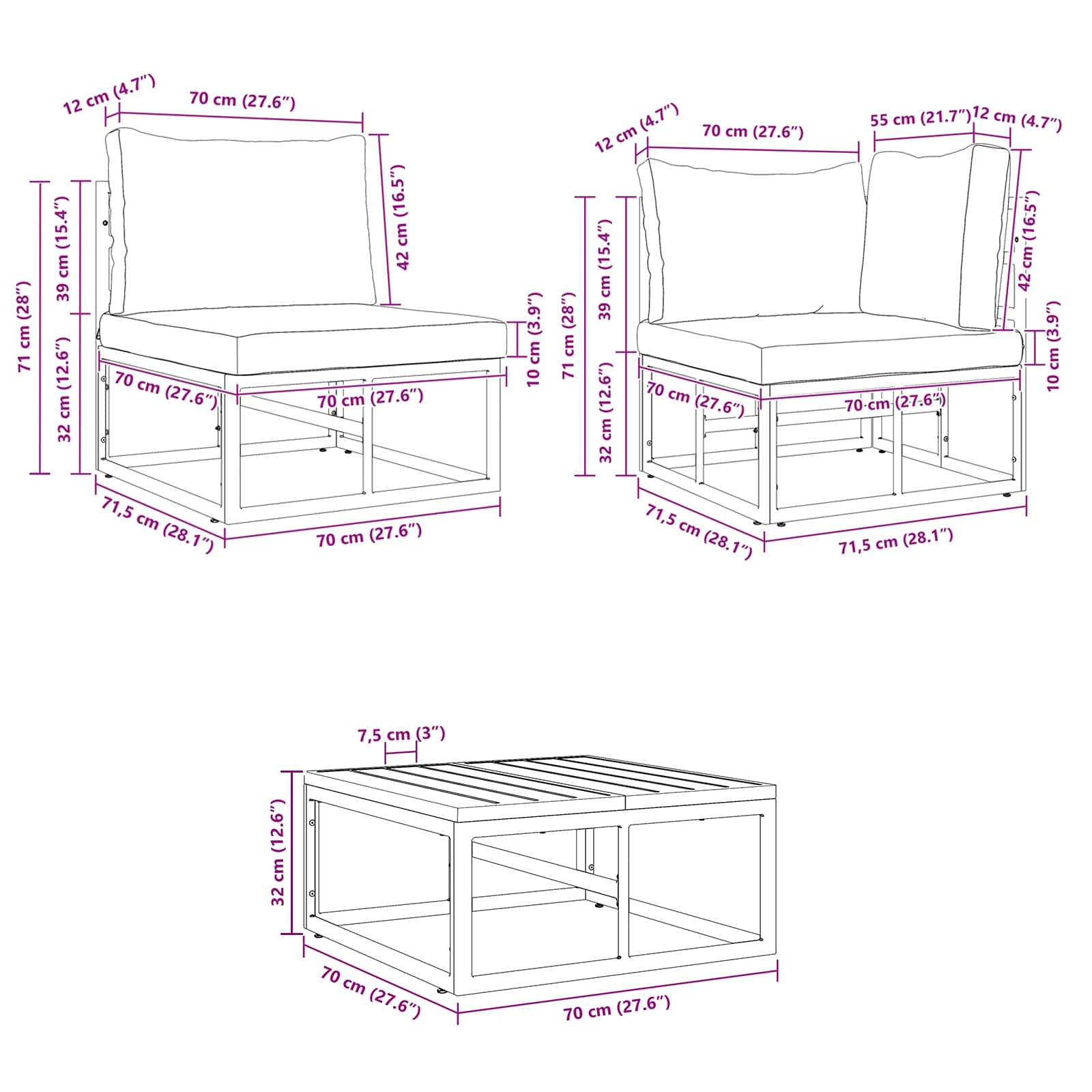 3 x siège central : 70 x 71.5 x 71 cm (LxWxH)