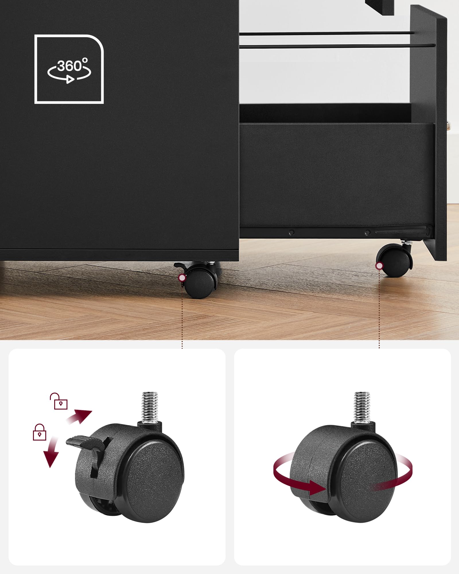 【BLOCCABILE E RUOTABILE A 360°】Questo mobile da ufficio è dotato di 5 ruote (2 con freno) che consentono di spostarlo liberamente o di lasciarlo fermo in un punto. La ruota extra nella parte anteriore del cassetto assicura una maggiore stabilità