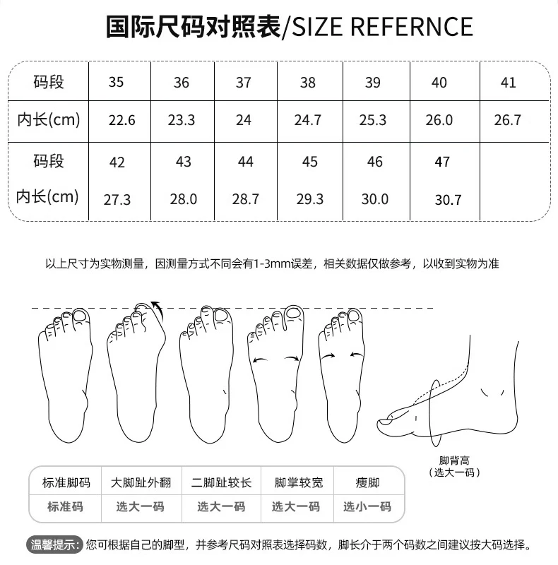 About The Size: Because each country uses different size standards, Please measure your feet length and according to our size chart to ensure correct fit. If you have wide feet, we suggest you choose one size larger.