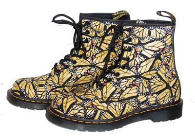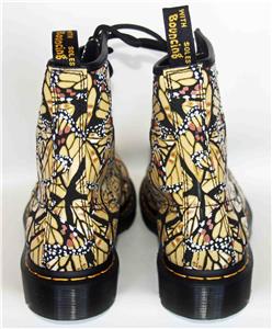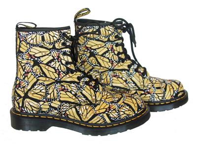 Dr. Martens Butterfly Print Shimmery Overlay Suede Leather 1460 Boots. Heel loop, 1" heel, heavy duty stitching. Goodyear-welted lines heat-sealed and reinforced with signature welt stitch. Air Wair bouncing cushion soles. Women's US size 7.