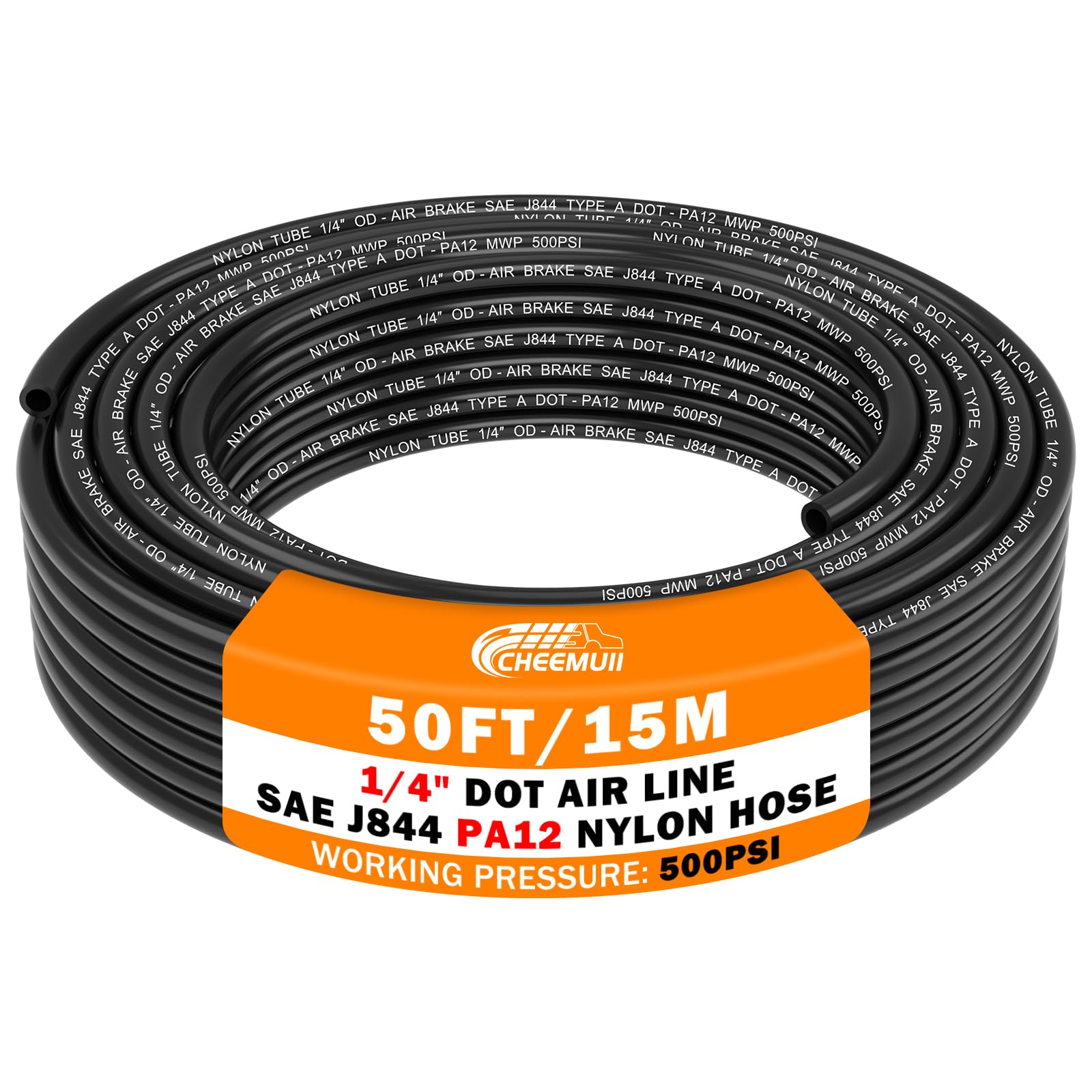 PREMIUM PA12 DOT AIR HOSE: CheeMuii DOT air lines are made of high-quality Polyamide 12 nylon, meet D.O.T. FMVSS 571.106 approved, SAE J844 air brake system requirements, with corrosion resistance, high-temperature flexibility, high-pressure resistance and long service life