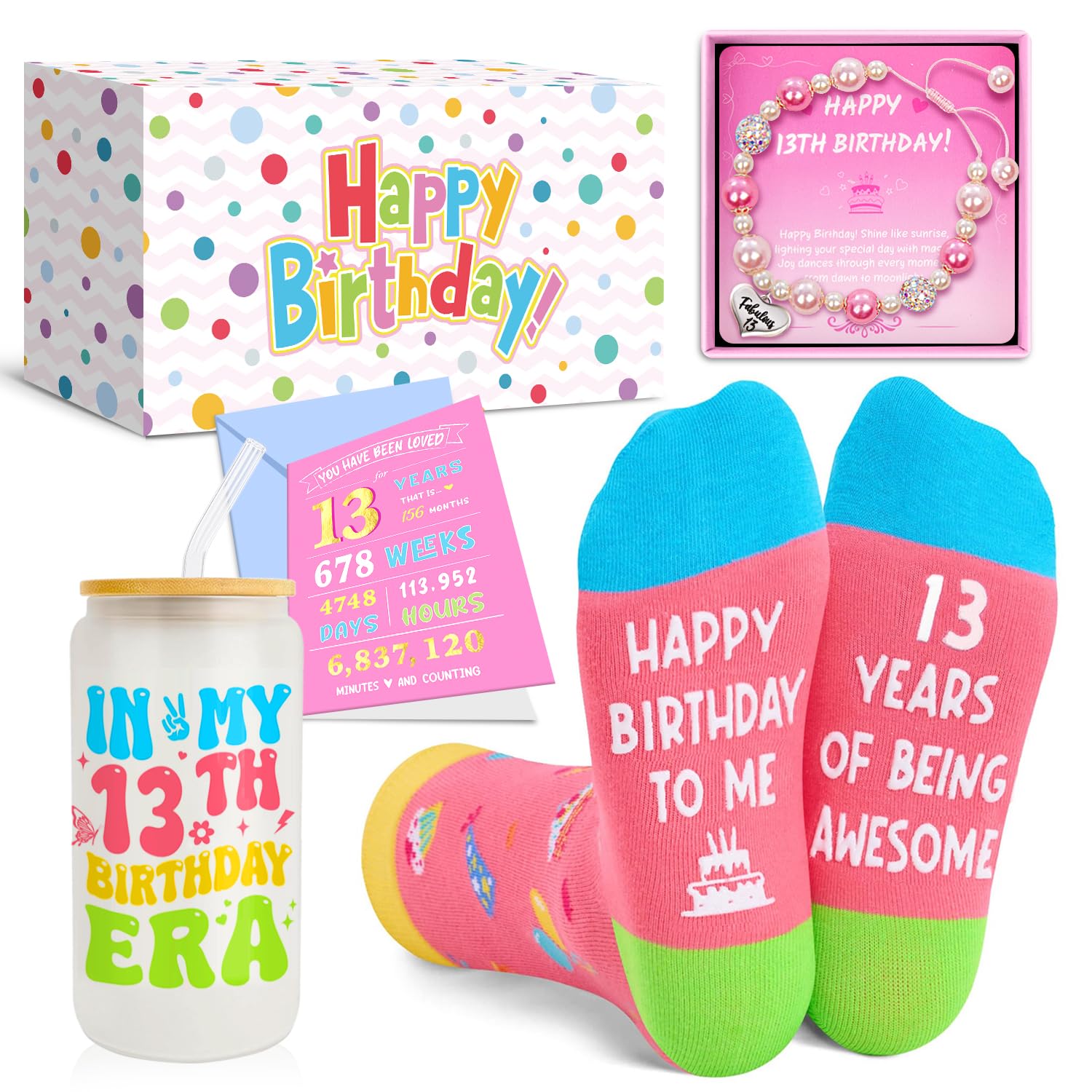 - 4PCS UNIQUE 13TH BIRTHDAY GIFTS: Including 1 x “IN MY 13TH BIRTHDAY ERA” 13oz Glass Tumbler, 1 x “Happy 13 Years of Being Awesome” Socks, 1 x “678 Weeks, 6837120 Minutes” Milestone Card, and 1 x Elegant Beaded Adjustable Bracelet(5" to 9").