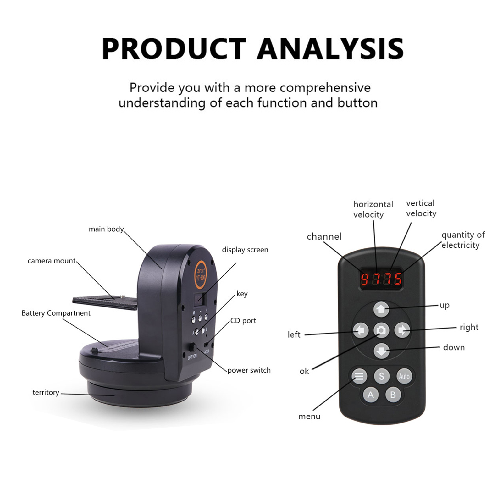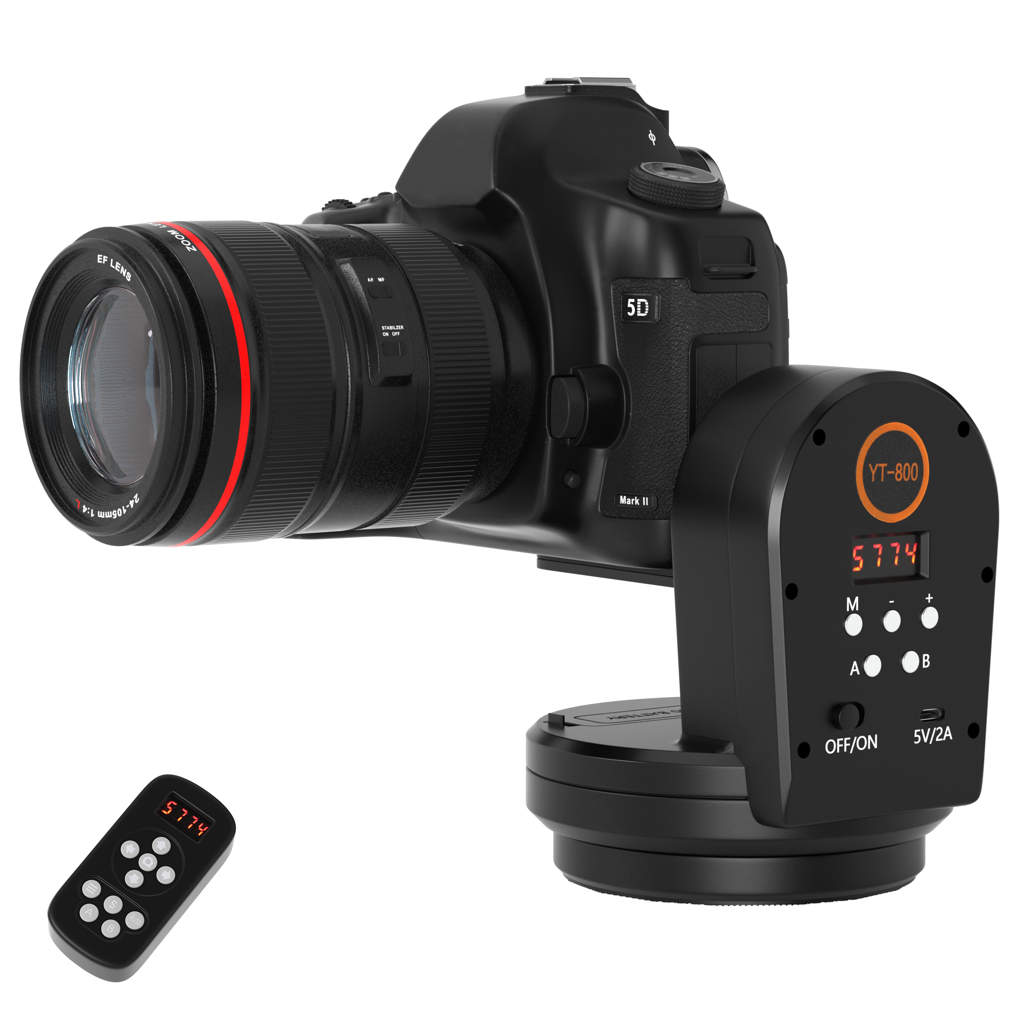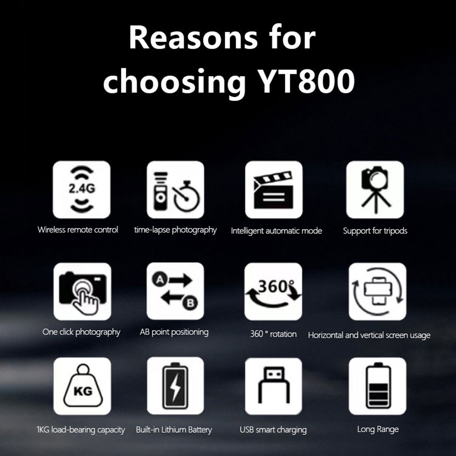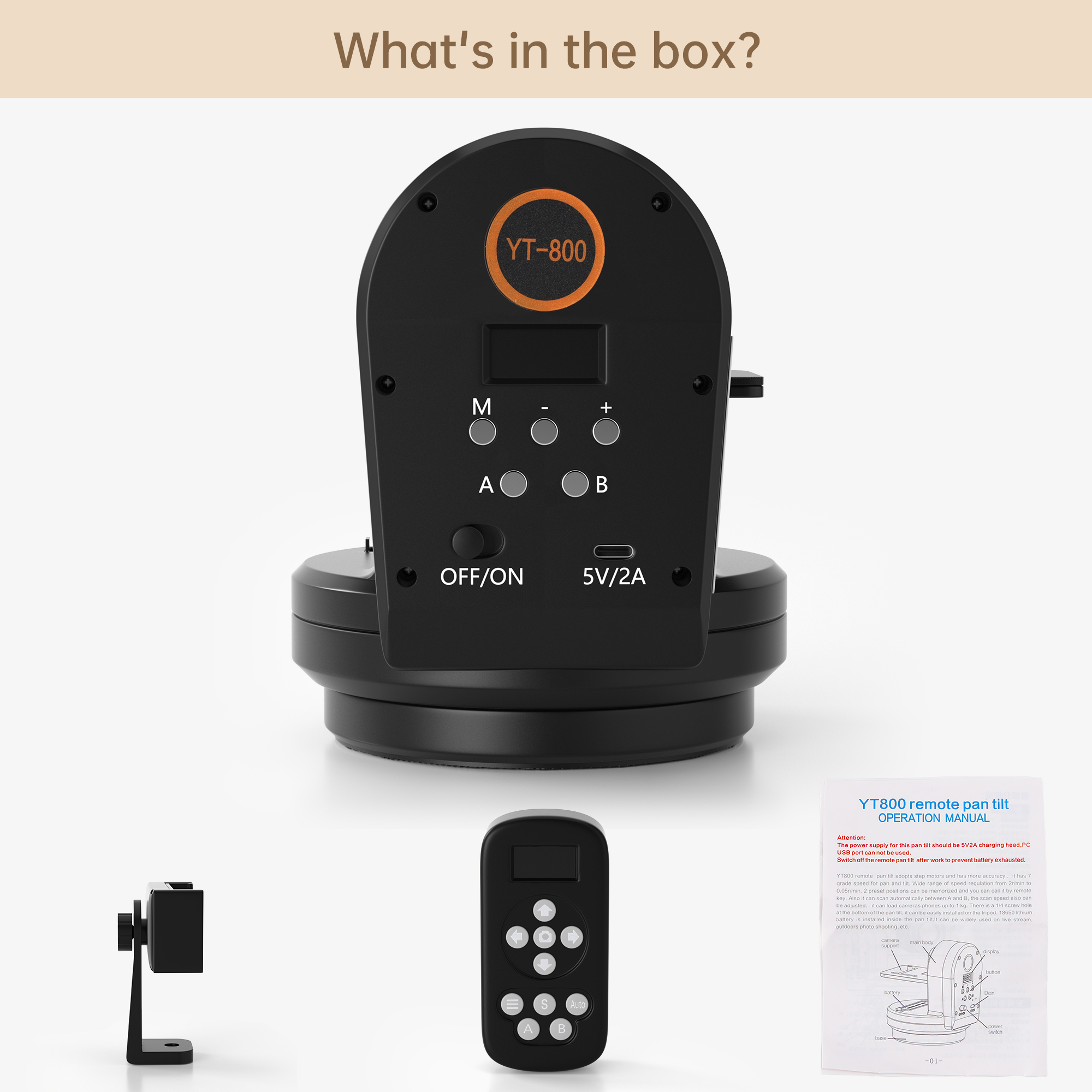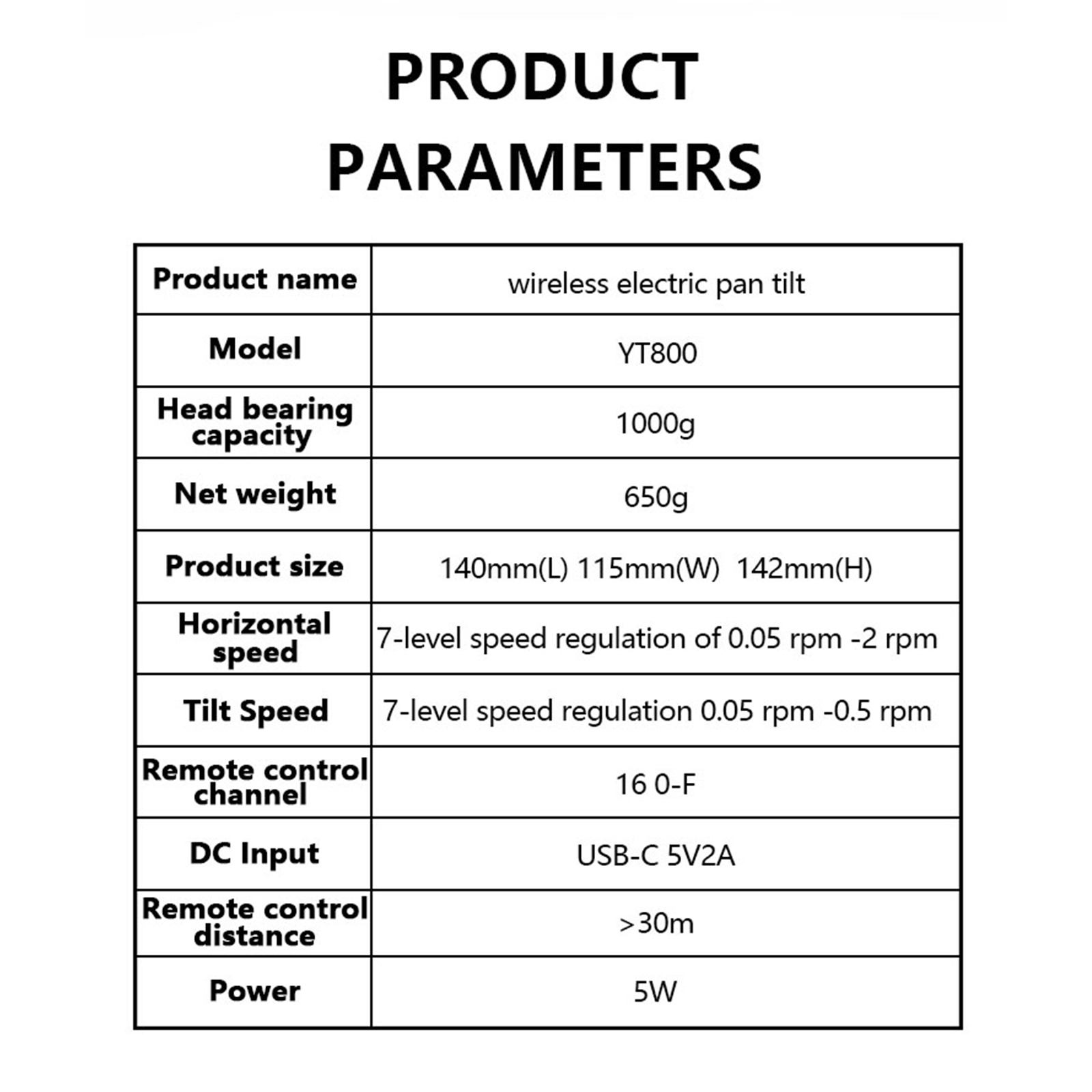 YT-800 remote control electric cloud platform is driven by step motor, with high positioning accuracy, high level of this gimbal, vertical vertical speed, speed regulation range from 2 to 0.05 rpm, and the speed regulation range is wide. There are 2 preset positions, 2 fixed positions can be set, and one -click retraction can be set with one click. Yundai can scan at the set speed between point A and B.YT800 Yundai bearing 1 kg, suitable for mobile phones, cameras, ordinary micro -single cameras. There are 1/4 screw holes under the gimbal, which can be convenient to install on the tripod. The built -in 18650 battery can be widely used in live broadcasts, outdoor photography and other occasions.