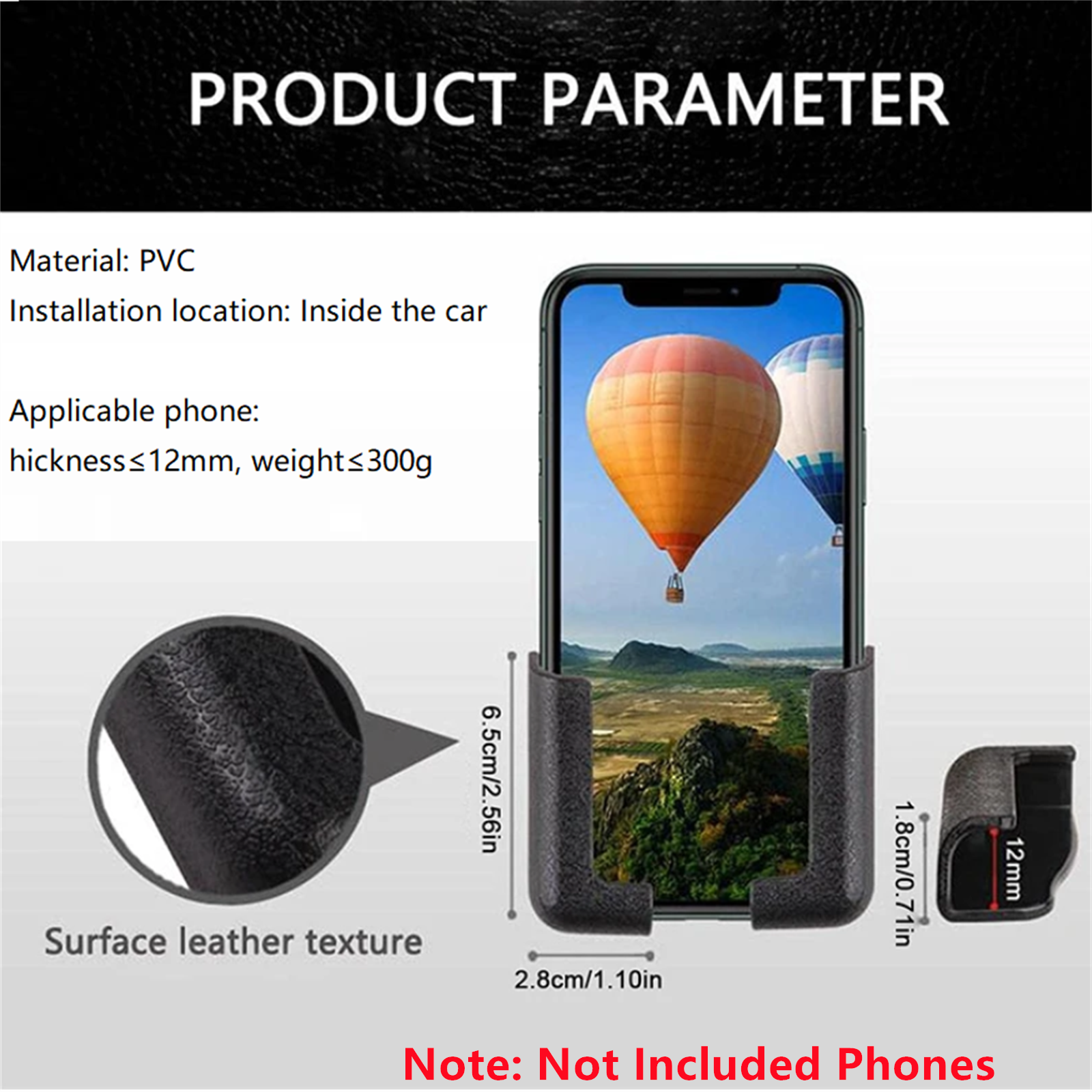Specifications: Material: PVC Color: Black Product size: 65 * 28 * 18mm/2.56*1.10*0.71" Installation position: Car interior Applicable mobile phone: Thickness not more than 12mm/0.47", Net weight not more than 300g
