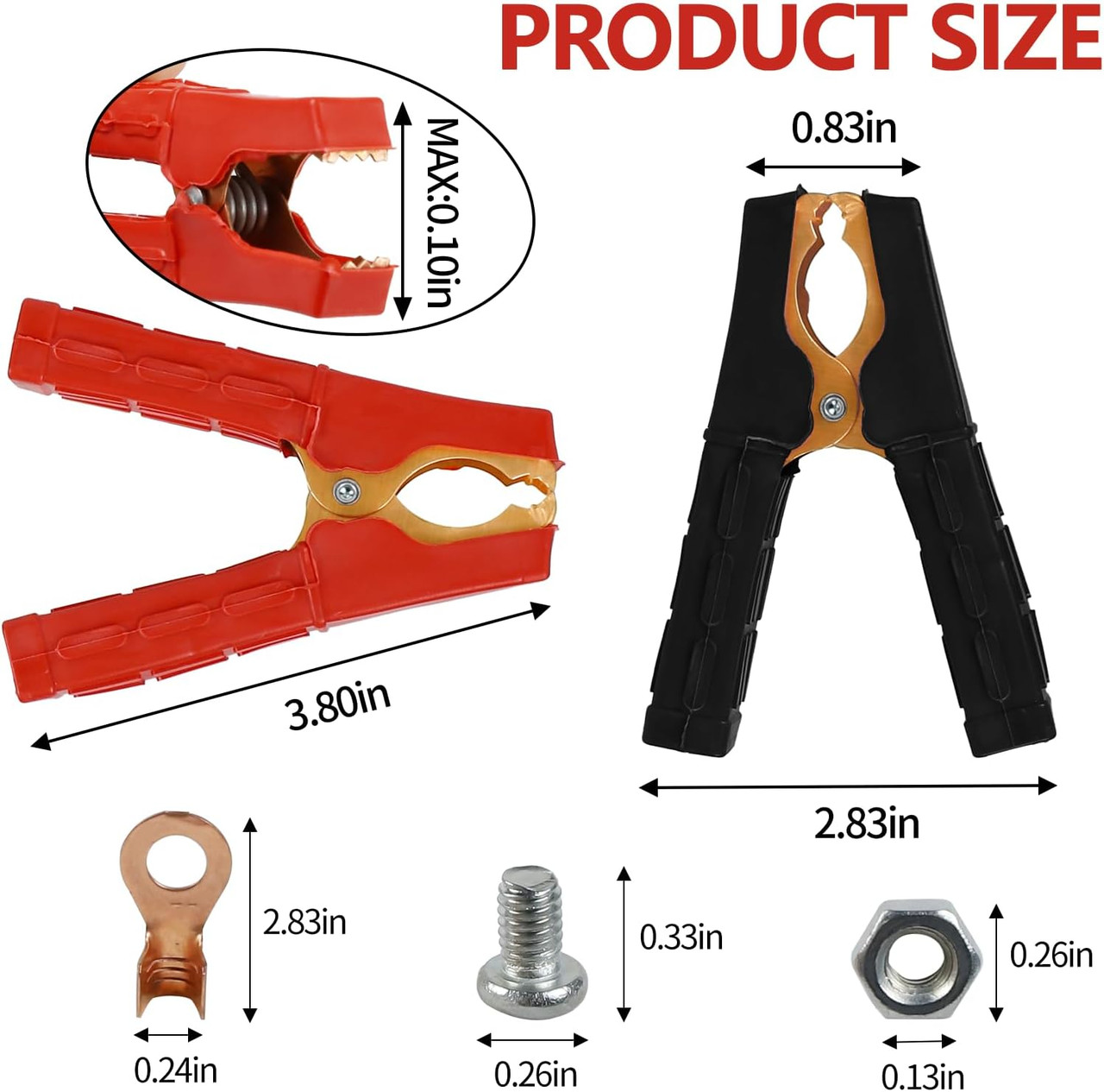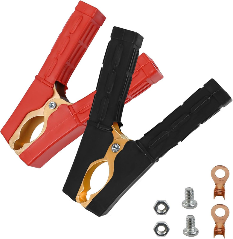 - ✔ Includes: 1 Red Clamp (Positive), 1 Black Clamp (Negative), 2 Crimp Cable Ends, 2 Screws, 2 Nuts