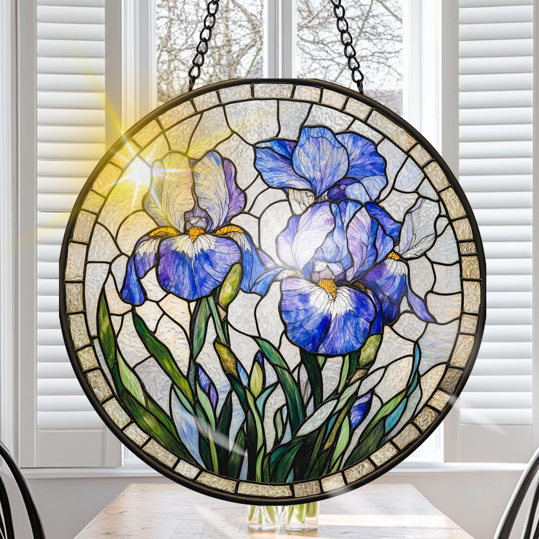 Stained Glass Suncatcher-A Heartfelt GiftIf you are looking for a beautiful decorative piece for your home, the stained glass window hanging is an excellent choice.Make your family or friend feel extra special with a one-of-a-kind, stained glass suncatcher. This beautifully handcrafted suncatcher adds a touch that will be treasured forever.Key Features:Stained Glass Window HangingOur stained glass is double-sided light-transmissive and emits a variety of mesmerizing lights when sunlight hits its surface. The stained glass light catcher, hanging in your window, it will bring joy and beauty to your home and give you that feeling you have to enjoy the moment. This elegant window hanging will be appreciated by art enthusiasts and those who love home interior decoration.CraftsmanshipEach suncatcher is expertly handcrafted using high-quality stained glass, ensuring vibrant colors and intricate details. The translucent nature of the glass allows sunlight to pass through, creating a beautiful, radiant effect that adds warmth and charm to any room.Beautiful & Unique GiftWhether it's a birthday, Mother's Day, Valentine's Day, Christmas, Thanksgiving, anniversary, housewarming, graduation, wedding, anniversary, so gifting a stained glass has profound meaning. You are not just presenting a cute decoration, but filled with blessings, encouragement, and good wishes for others.Easy to DisplayComes with a convenient hanging hook, allowing you to display it easily in a window or anywhere he likes.SpecificationMaterial: Stained GlassDimension: 7.8 inchNotes:1. Before hanging the stained glass window hanging, make sure the cup hook is securely sucked.2. Not suitable for rough walls such as painted walls, stone walls, or wooden walls.