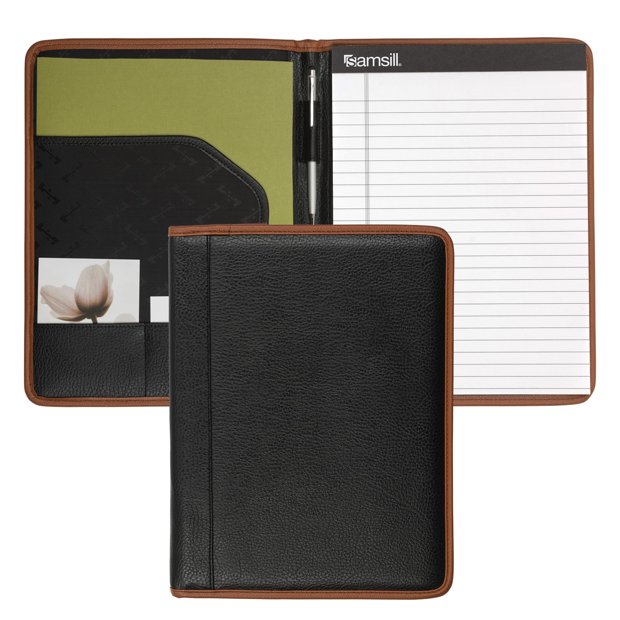 Samsill's Hampton Series' textured grain faux-leather padfolio organizer makes an indispensable tool for work and home. This stylish black and brown business portfolio for women and men features a minimalist design complete with soft, flexible leather-like covers enhanced with sewn edges for added durability. A large inner-document pocket allows you to keep notes, legal papers, business proposals, and other documents safe and neatly organized. These interior pockets accommodate your business and credit cards, ID cards, flash drives, etc. The 8.5 x 11 inch lined writing pad included in this pad holder allows you to quickly take notes while in a meeting, classroom, or any other setting where you need to jot down important information right away. The possibilities are endless with this porfolio! Check out the Samsill Storefront for all your organization supplies, small business essentials, and classroom needs.