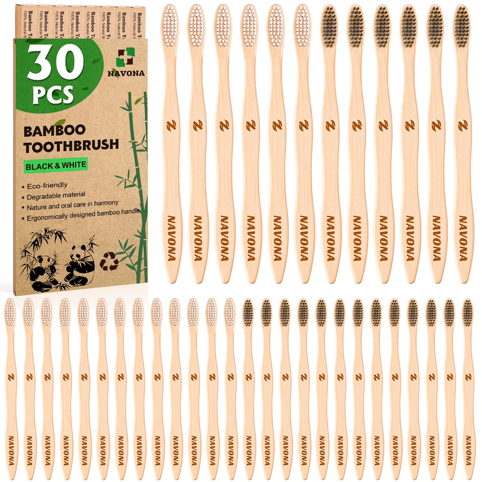 Navona 30 PCS Bamboo Toothbrushes Pack, BPA 1 Count (Pack of 30), Black White