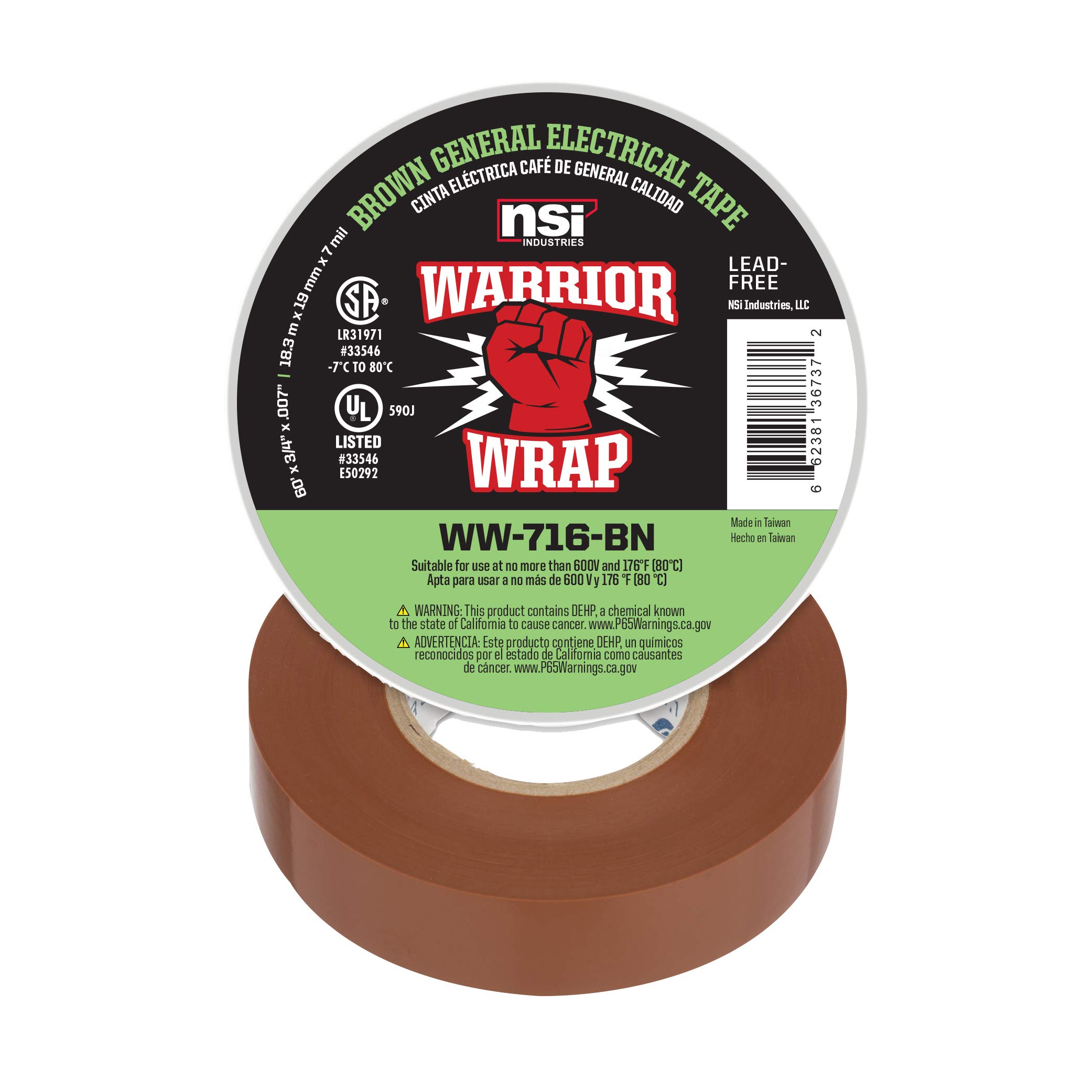 The Warrior Wrap General brown electrical tape provides tight and secure protection with high quality and durability, combining good adhesion, elasticity and resistance for all weather conditions. This tape can wrap up every residential or commercial project from simple jobs to complex. Withstanding weather elements without flagging, cracking or losing adhesion — from below zero to scorching temperatures — this electrical tape's rugged durability is engineered to resist harsh UV rays, rain, wind and snow. The Warrior Wrap 7 mil product family is available in 10 total colors for specific project needs to help with color coding cables or labeling other items. The additional colors include black, red, orange, yellow, green, blue, violet, gray and white. The Warrior Wrap electrical tape product line also offers Select (WW-722) and Premium (WW-732/WW-832) tapes for enhanced performance and capabilities. The Warrior Wrap Premium line offers an 8. 5 mil thickness product available in black for the most extreme environments. Warrior Wrap products are UL Listed and CSA Certified for consumer confidence, adding peace of mind to safety and quality concerns.