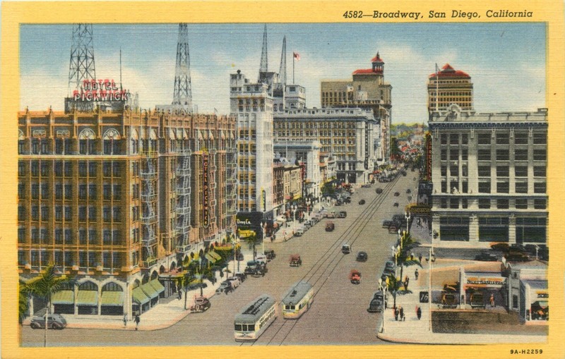 1940s Broadway, Streetcars Downtown San Diego, California Vintage Postcard
