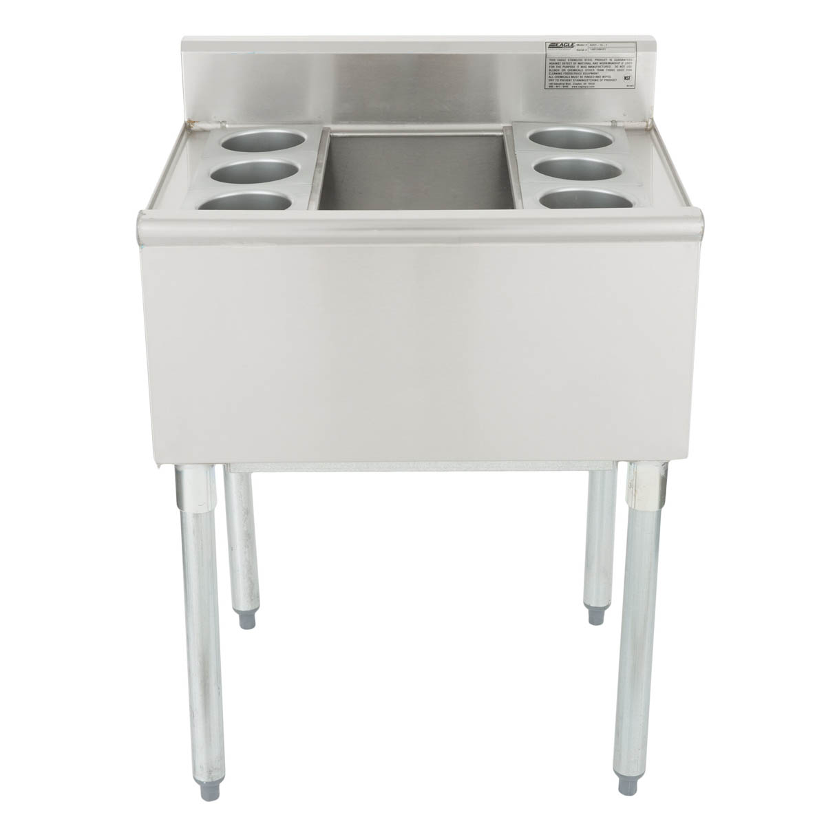 Top, front, backsplash and ice bin to be heavy gauge type 304 stainless steel. Fabricated ice bin is fully insulated, with 1 1⁄2˝ drain and plastic bottle holders. 1 5⁄8˝ O.D. galvanized tubular legs with adjustable bullet feet.