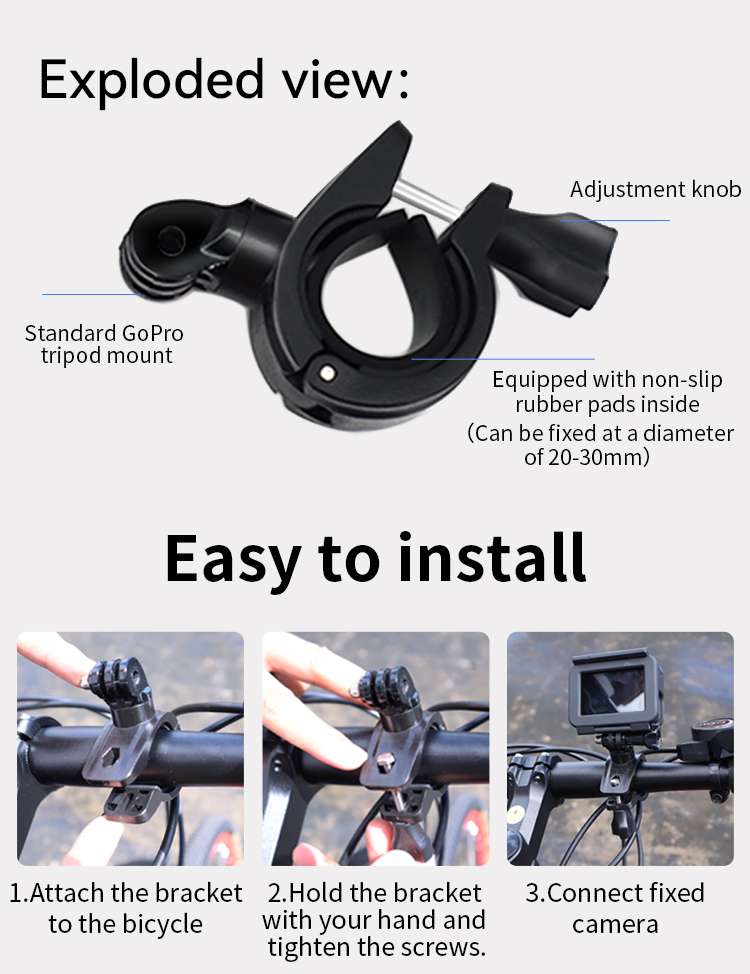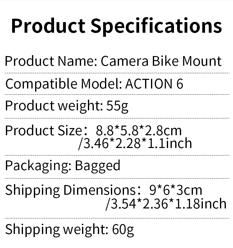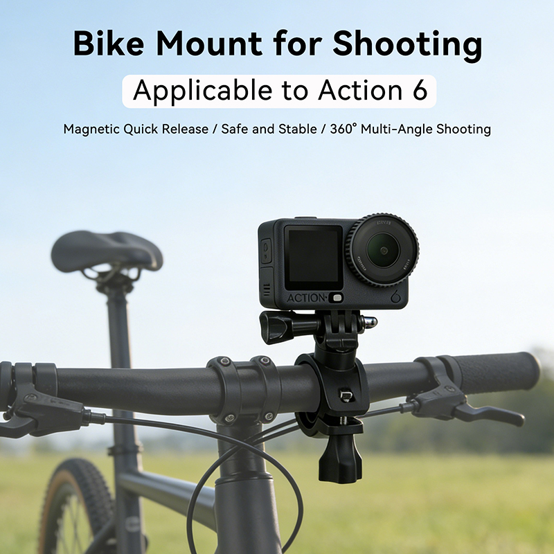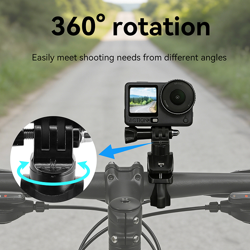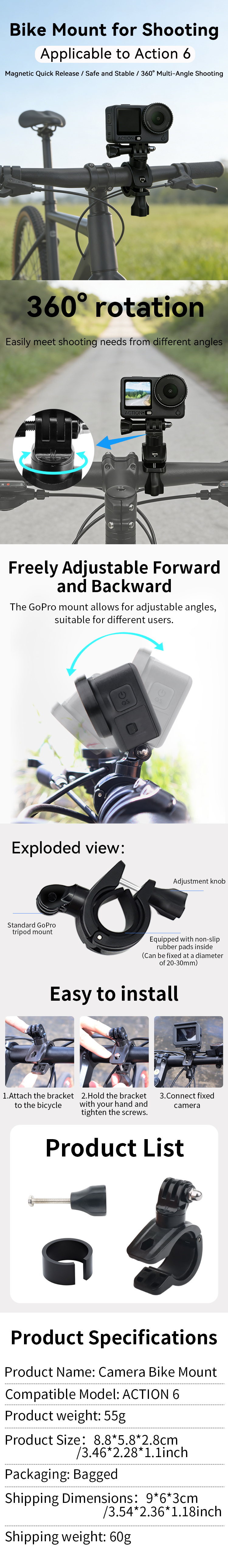 1. Compatible with Action 6 cycling mount, made from eco-friendly plastic for safety, stability, and durability. Features 360° rotation angle adjustment for effortless shooting at various angles with front-to-back flexibility;