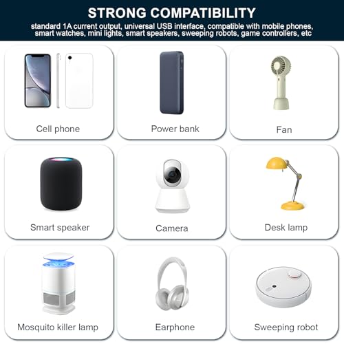 Forte Compatibilité : Sortie de courant standard 1A, interface USB universelle, compatible avec les téléphones mobiles, les montres intelligentes, les mini lumières, les haut-parleurs intelligents, les robots de balayage et les contrôleurs de jeu, etc.