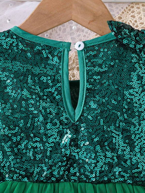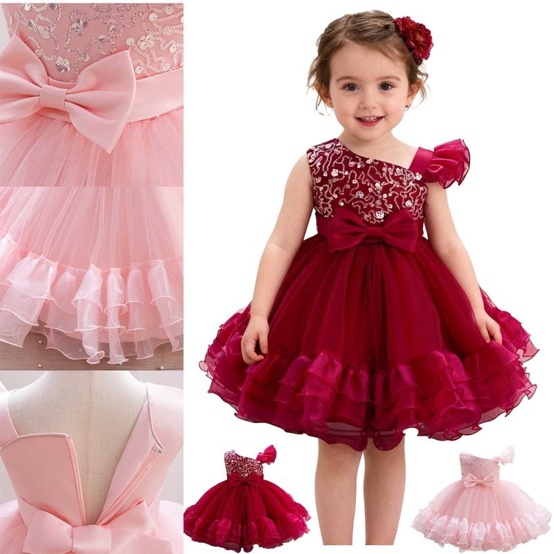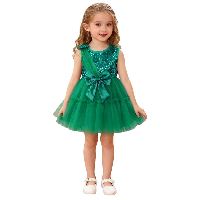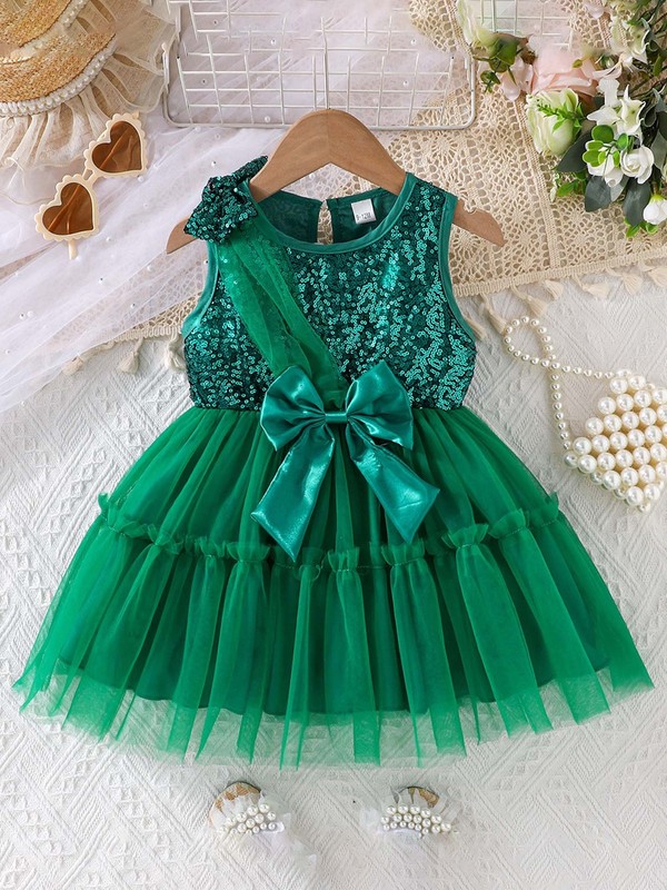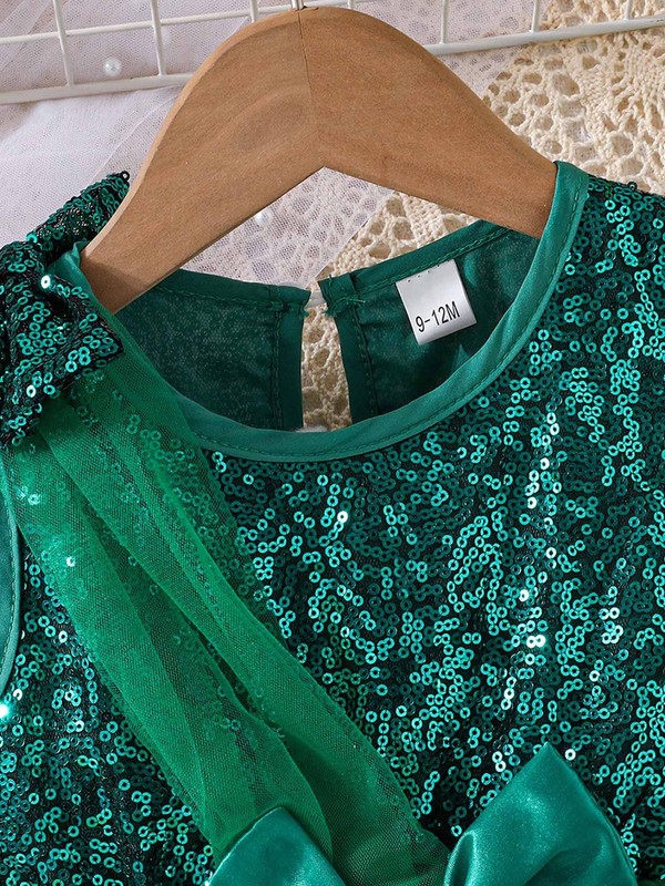 The shiny sequins bodice with a bow detail adds a touch of glamour and sparkle, making your baby girl stand out in the crowd.