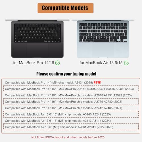 Compatible avec MacBook Air 15/13,6 Pouce (M4/M3/M2) 2025-2022 et Pro 14/16 Pouce (M5/M4/M3/M2/M1) Disposition au Royaume-Uni et dans l’UE Modèle: A3434 A3240 A3241 A3112 A3185 A3186 A3401 A3403 A3114 A3113 A2992 A2991 A2918 A2779 A2780 A2941 A2681 A2442 A2485(pas adapté au 2020 Air M1 A2337 A2179)